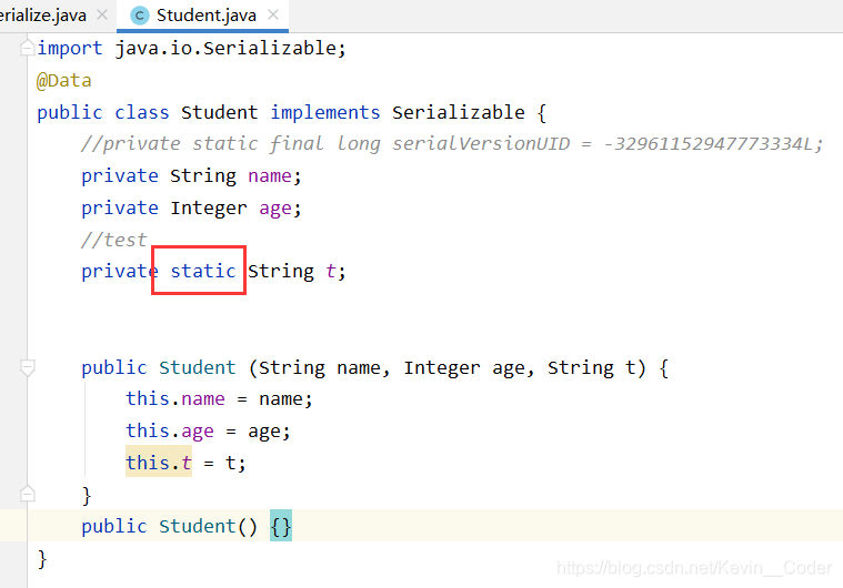 1. 使用static关键字:序列化保存的是对象的状态(而不是类的状态),忽略静态域中的变量数据。