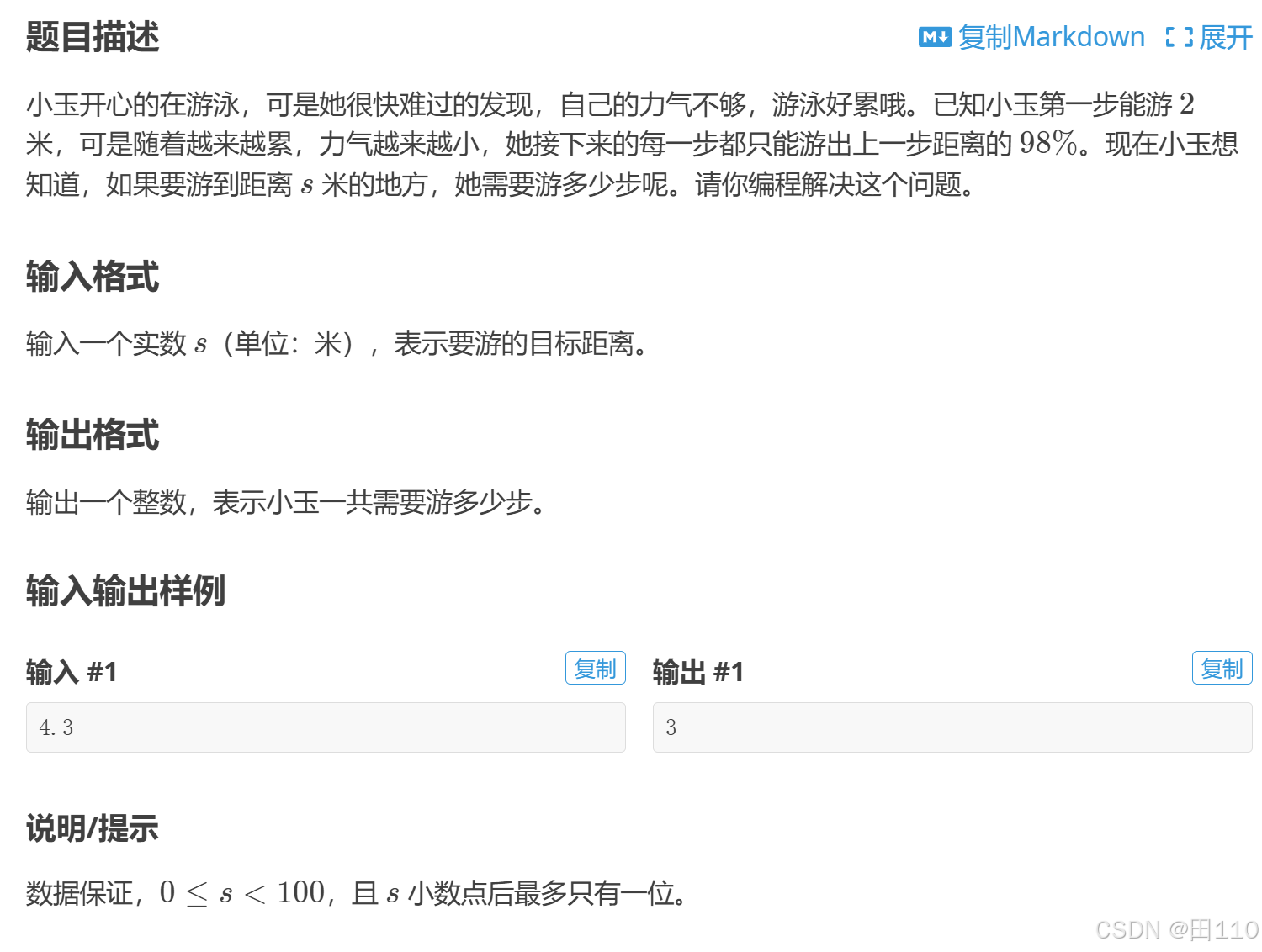 很快就能想到两种思路,法一:先定义一个函数f(int x),求出2*0.98^x,也就是这个等比数列的第x+1项.接着定义 float sum=0,s. int i=1. s就是输入的路程,i就是游的步数。当sum小于s的时候,sum=sum+f(i),然后i再自增1。这样就实现了f(1)+f(2)+...的计算(f(n)就相当于an,sum就相当于an的前n项和Sn)。然后输出即可。这里需要注意的是,由于在while循环中,先让sum自增,再让i自增,这样会导致输出的i并不是游过的步数,而是步数+1.