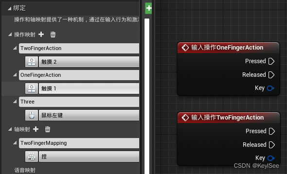 轴绑定:在项目设置的输入里绑定相应函数,触摸1是一只手指,触摸2是两只手指。