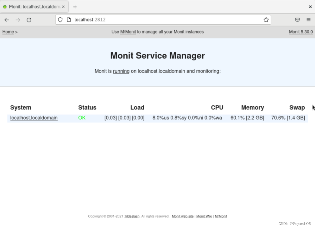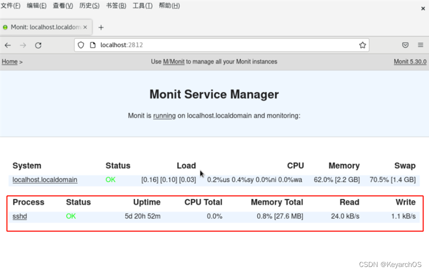 1、使用浏览器访问localhost:2812,用户名admin,密码monit: