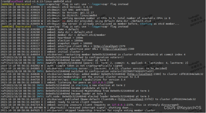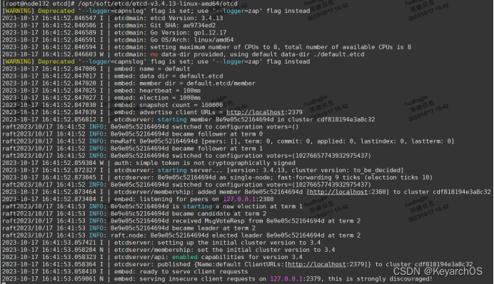 输入命令etcd,即可启动一个单节点的etcd服务,ctrl+c即可停止服务。这里讲解一下etcd服务启动后控制台显示的各个参数的意义: