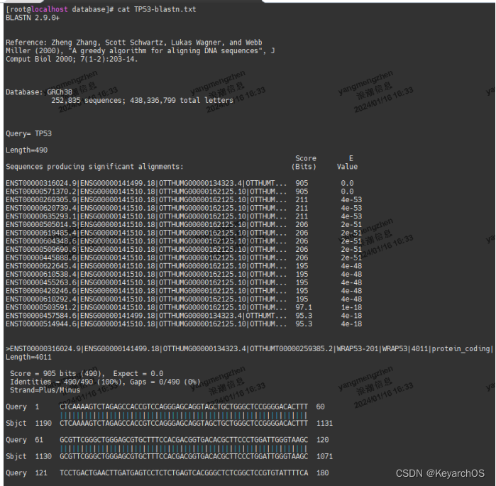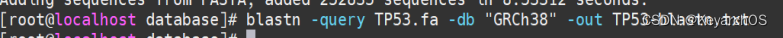 进入database目录下,执行命令:blastn -query TP53.fa -db "GRCh38" -out TP53-blastn.txt
