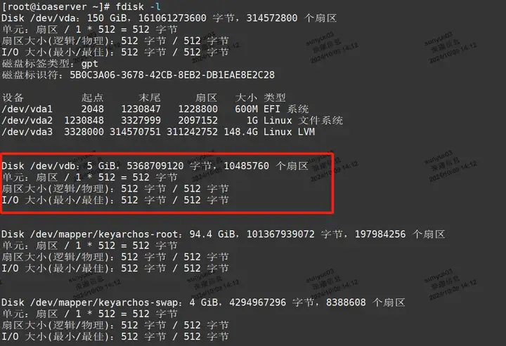 执行fdisk -l查看磁盘信息,/dev/vdb为我们新加的磁盘