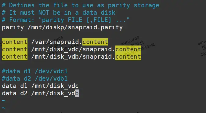 执行vim /etc/snapraid.conf编辑snapraid配置文件