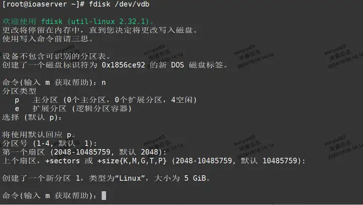 使用fdisk对磁盘创建分区,创建完后输入w保存