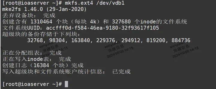 使用mkfs.ext4 /dev/vdb1格式化分区