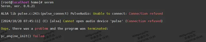 输入seren,提示ALSA库试图连接到PulseAudio服务器,但连接被拒绝failed