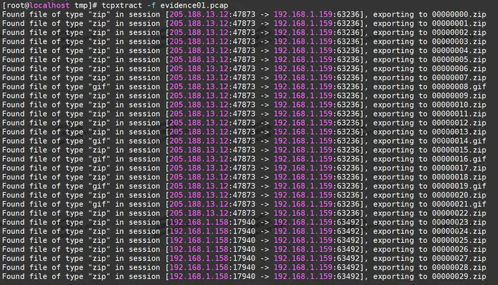 tcpxtract是一个基于文件签名从网络流量中提取文件的工具。 基于文件类型的页眉和页脚提取文件(有时称为“雕刻”)是一种古老的数据恢复技术。 像Foremost这样的工具使用这种技术从任意数据流中恢复文件。 Tcpxtract专门使用这种技术来拦截通过网络传输的文件。 满足类似需求的其他工具是漂网和EtherPEG。 driftnet和EtherPEG是用于监视和提取网络上的图形文件的工具,通常由网络管理员用于监视其用户的互联网活动。 driftnet和EtherPEG的主要局限性在于它们只支持三种文件类型,而且无法简单地添加更多文件类型。 他们使用的搜索技术也是不可扩展的,不能跨数据包边界搜索。详细见官网https://tcpxtract.sourceforge.net/。