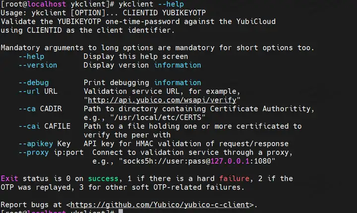 --url URL:指定验证服务的 URL,默认可能是"http://api.yubico.com/wsapi/verify"。