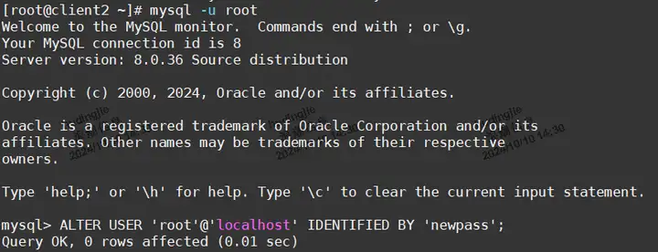 ALTER USER 'root'@'localhost' IDENTIFIED BY 'newpass';