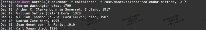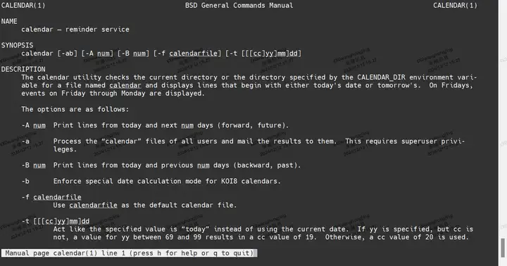calendar 是一个简单的日历提醒工具,常用于在 Unix 和类 Unix 系统中查看近期的重要日期或事件。用户可以通过创建和编辑特定格式的日历文件,将个人的纪念日、节假日或其他重要事件记录下来,并使用该工具快速查看未来或过去几天内的事件。详情请见官网http://man7.org。