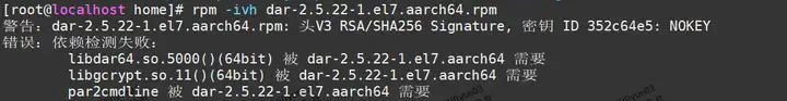使用rpm -ivh dar-2.5.22-1.el7.aarch64.rpm安装rpm包