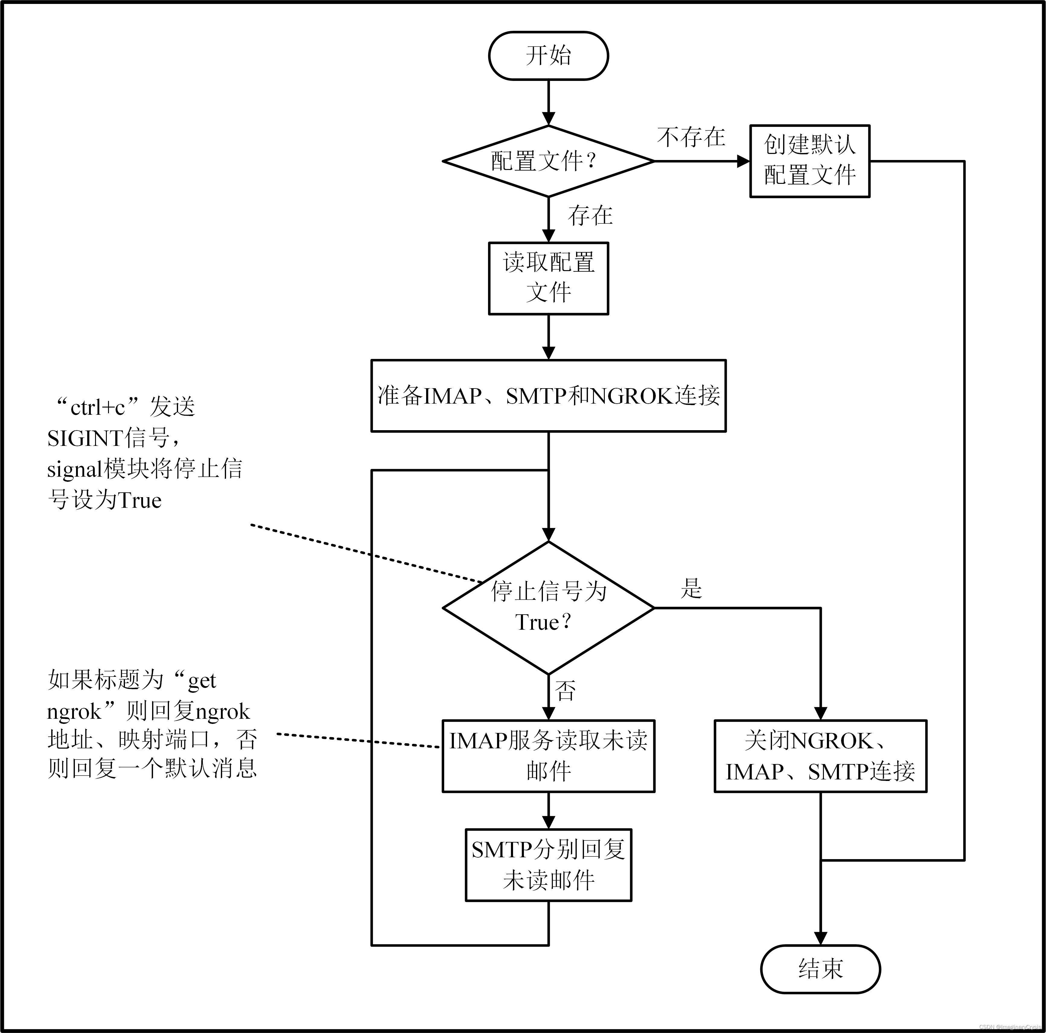向<imap_username>发送邮件,内容不限,标题为“get ngrok”,过几秒到十几秒,服务端会收到邮件,回复NGROK的公共地址(URL)和映射端口(port),例如收到内容如下的邮件: