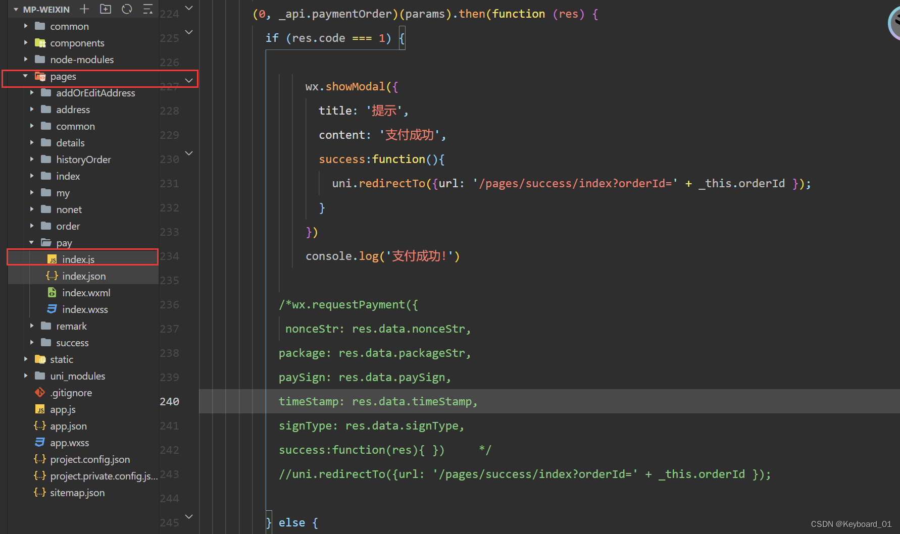 前端在小程序中修改pages->pay->index.js中第225行代码(或者Ctrl+F搜索handleSave定位),把支付成功的逻辑提到判断之外直接执行,原来的代码注释掉。