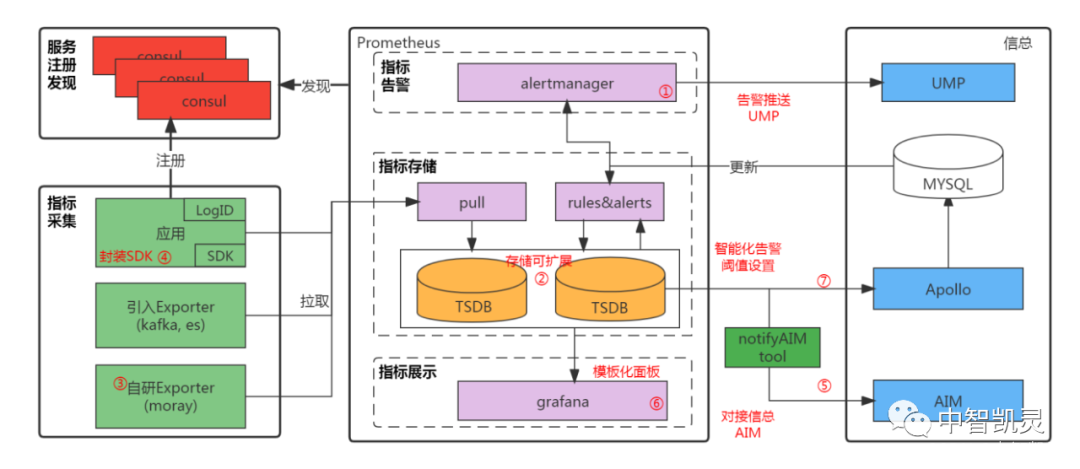 分为指标来源、指标存储、指标可视化和指标告警四个部分。