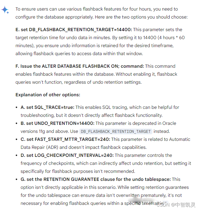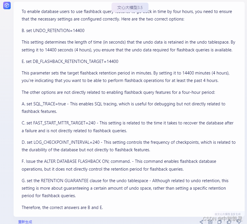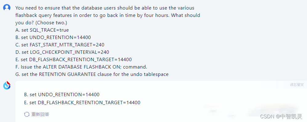 这道题目对于DBA通识大模型来说有点难度,因为容易把flashback query和flashback database弄混了。如果你了解这道题问的是flashback query,那么你就知道这是和UNDO RETENTION相关的,答案不言而喻就是B,G。