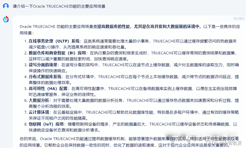 第一个问题是一个比较新的知识,用于考察大模型在对于新的知识的能力:“请介绍一下Oracle TRUECACHE功能的主要应用场景”。