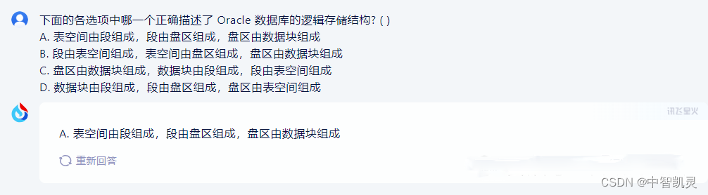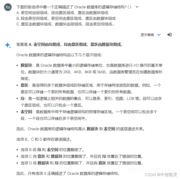 再来看一个新问题,这是一个基于知识的逻辑推理问题:下面的各选项中哪一个正确描述了 Oracle 数据库的逻辑存储结构? ( )