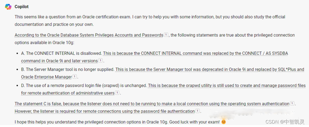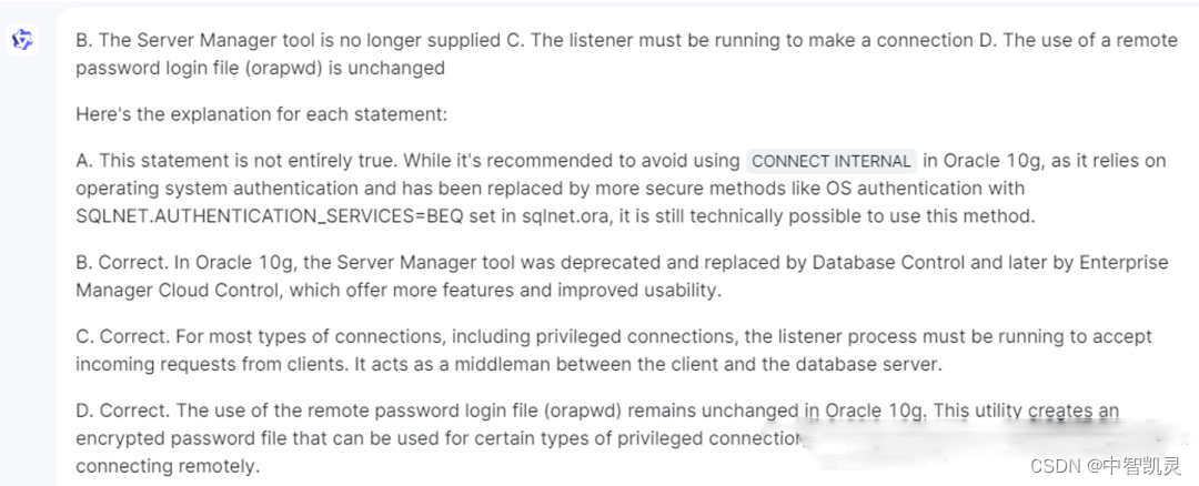 这是一道纯粹的知识问答,考察的是大模型对于知识,特别是比较过时的知识了解的全面性。如果对Oracle 10g和10g以前的版本缺乏了解的用户很难答对,因为他们可能都不知道connect internal是干啥用的,我估计很多Oracle DBA对于这道题也是无从入手的,就像前些年有个DBA去运维一套Oracle 8.0的时候,不知道该如何启动和关闭数据库一样。早期的Oracle数据库是在svrmgrl中用connect internal来本地连接数据库,然后做一些sysdba的操作的,比如启动关闭数据库实例。