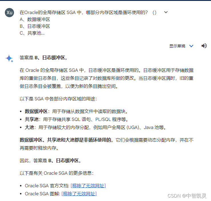 这回大家的回答都是满分,Gemini一雪前耻,不仅回答对了,还把错误的点都找对了,可以100+。星火则是言简意赅,想找毛病都没地方找去。看样子需要加大难度了,请看下一道十多年前Oracle精英工程师选拔赛的题目: