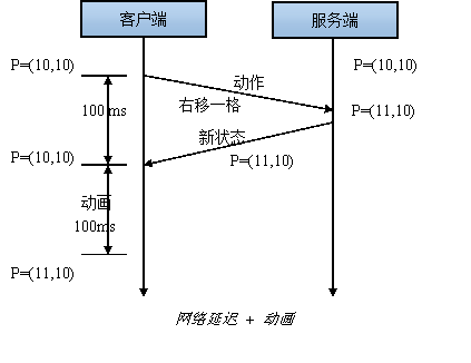 我们可以利用这一特点,在游戏世界是足够的可预测的情况下(即,给予的游戏状态和一系列输入,运行结果是完全可预测的)。假设存在着100毫秒的滞后,并且游戏角色移动一个格子的动画也需要100毫秒和话。使用之前的实现,整个动作得花200毫秒。