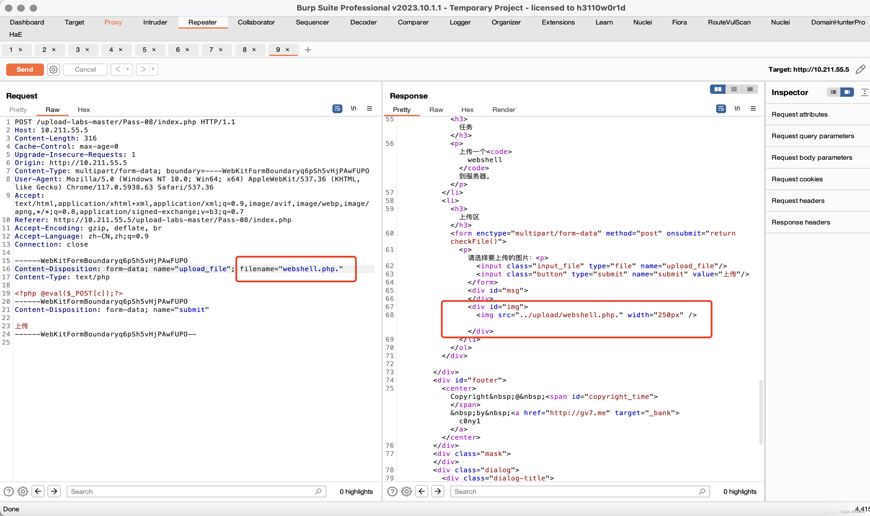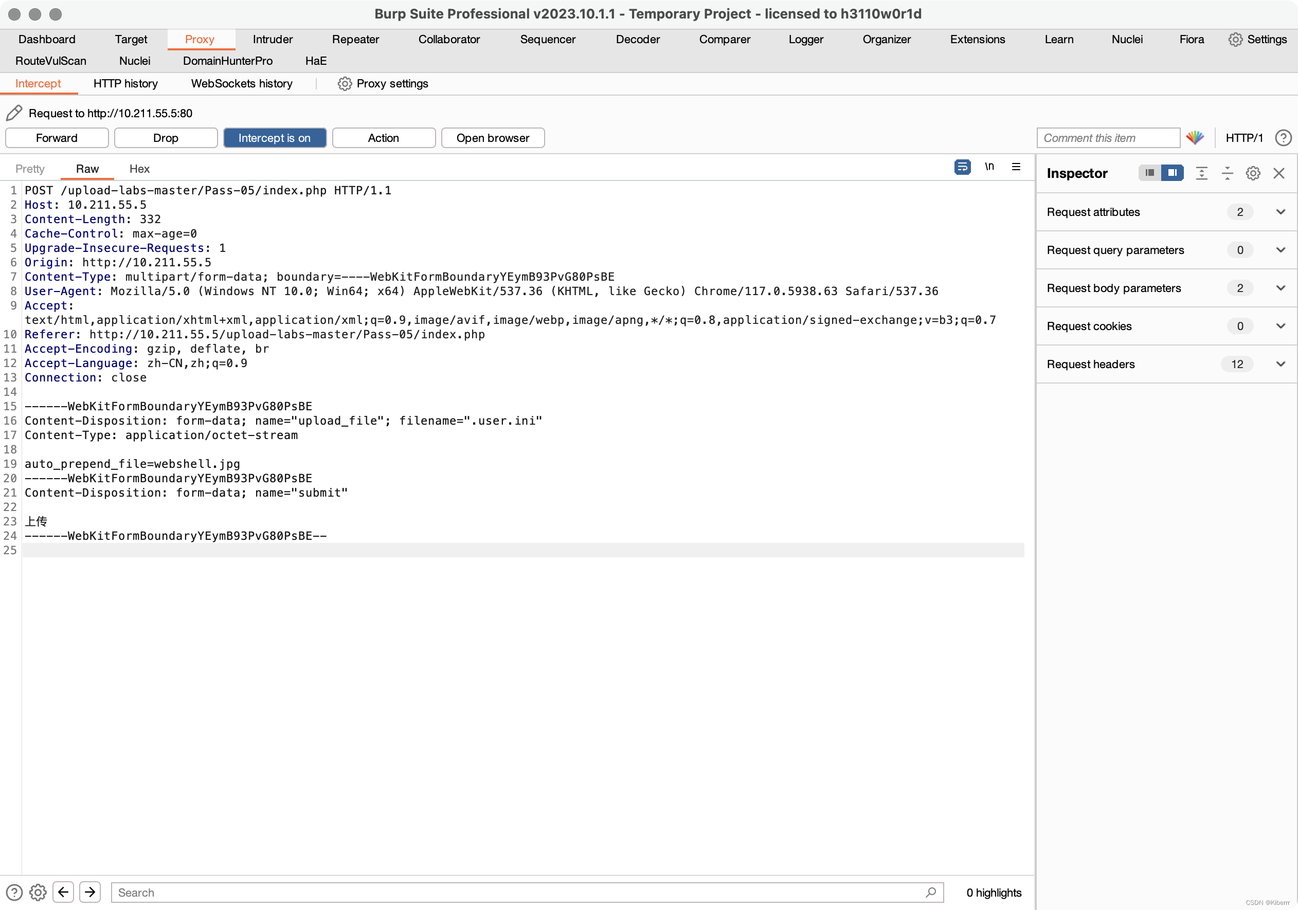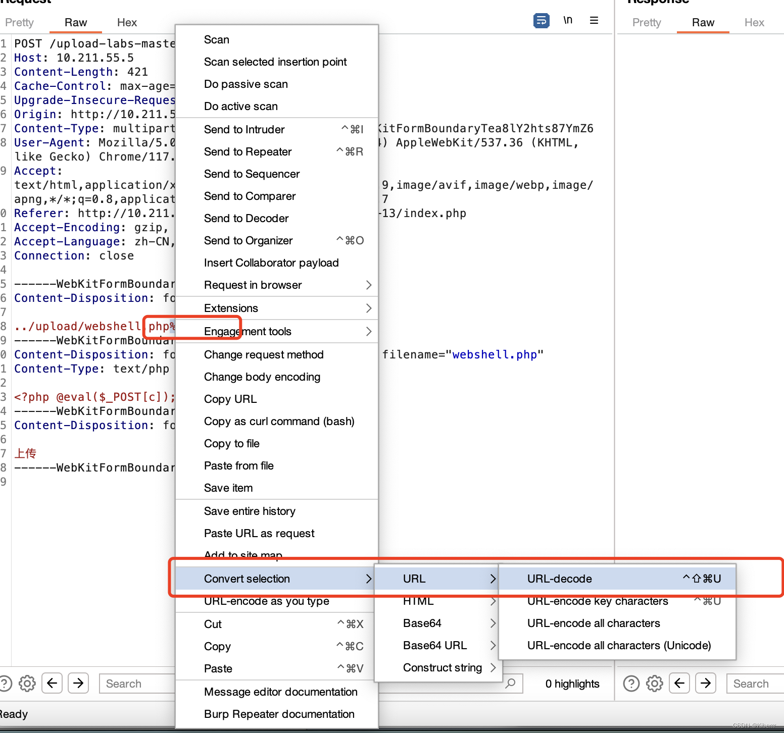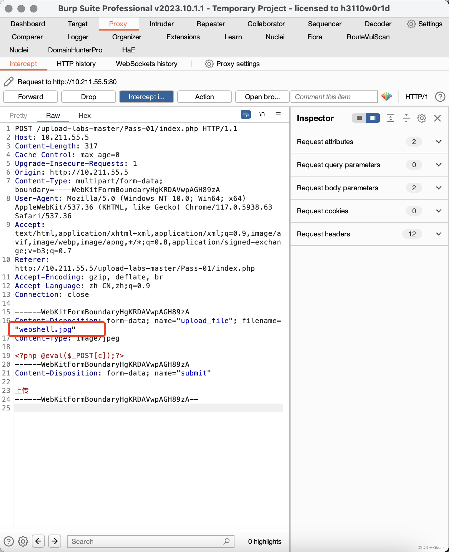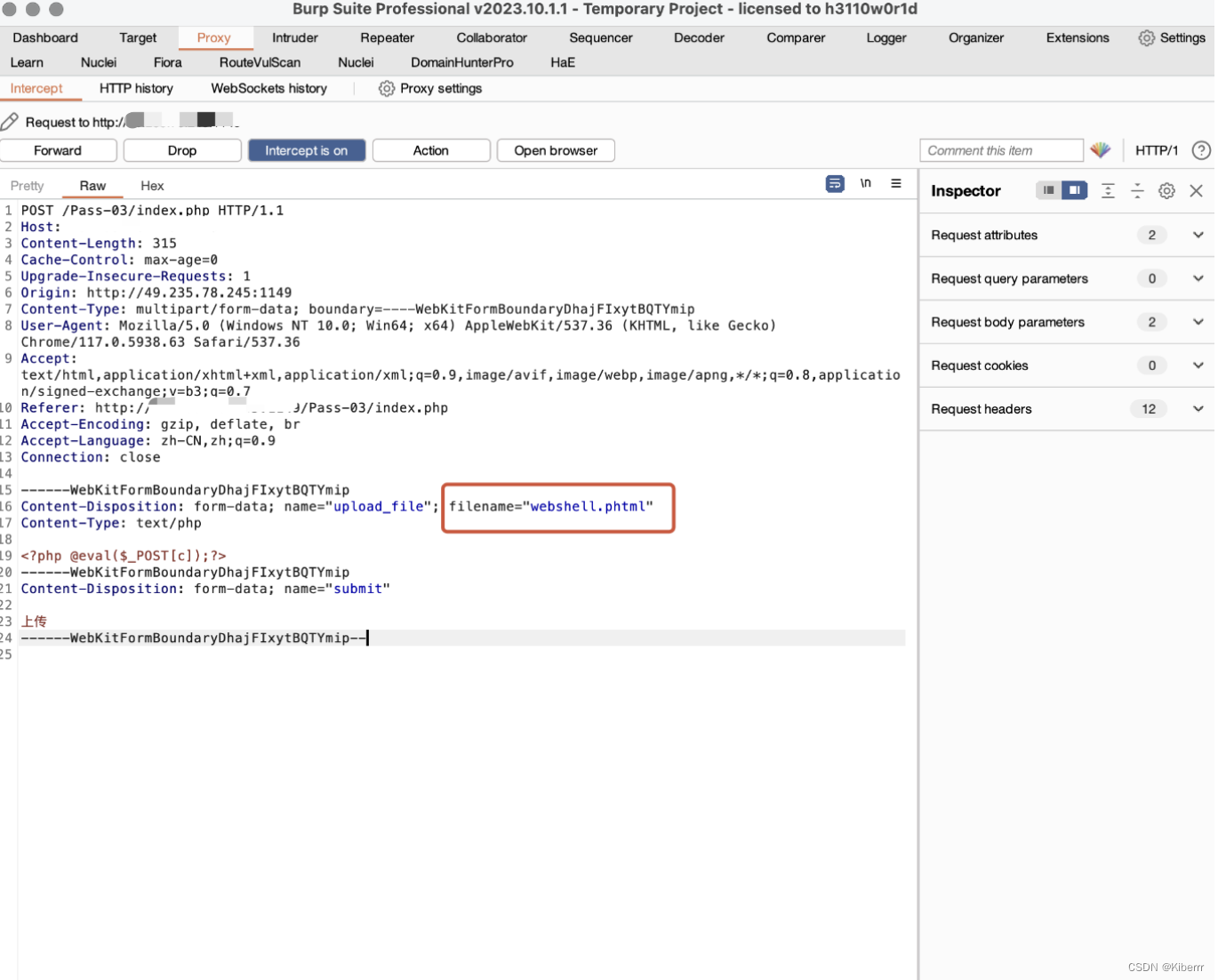 上传webshell.php并抓包, 修改文件名为webshell.Php