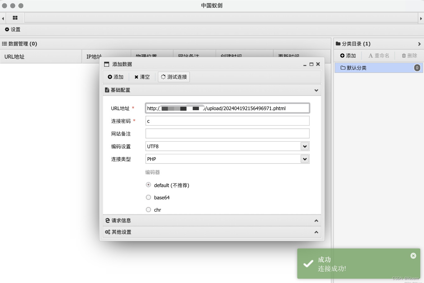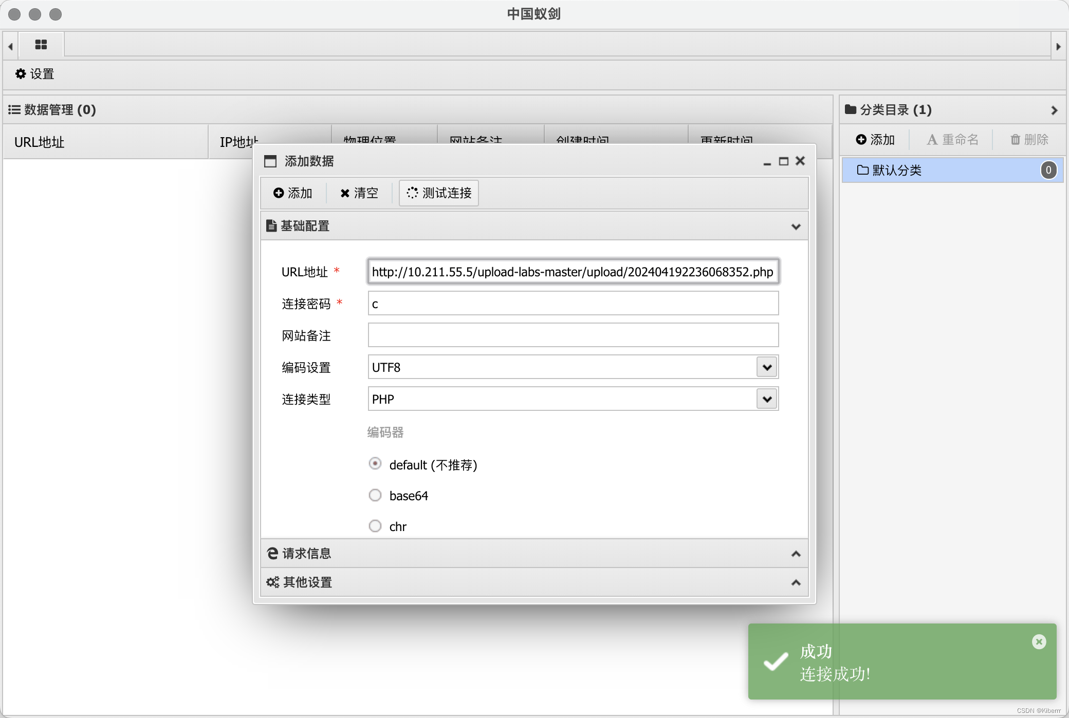 上传成功后,访问脚本文件,打开蚁剑, 输入webshell的路径和密码, 然后点击测试连接, 显示连接成功。