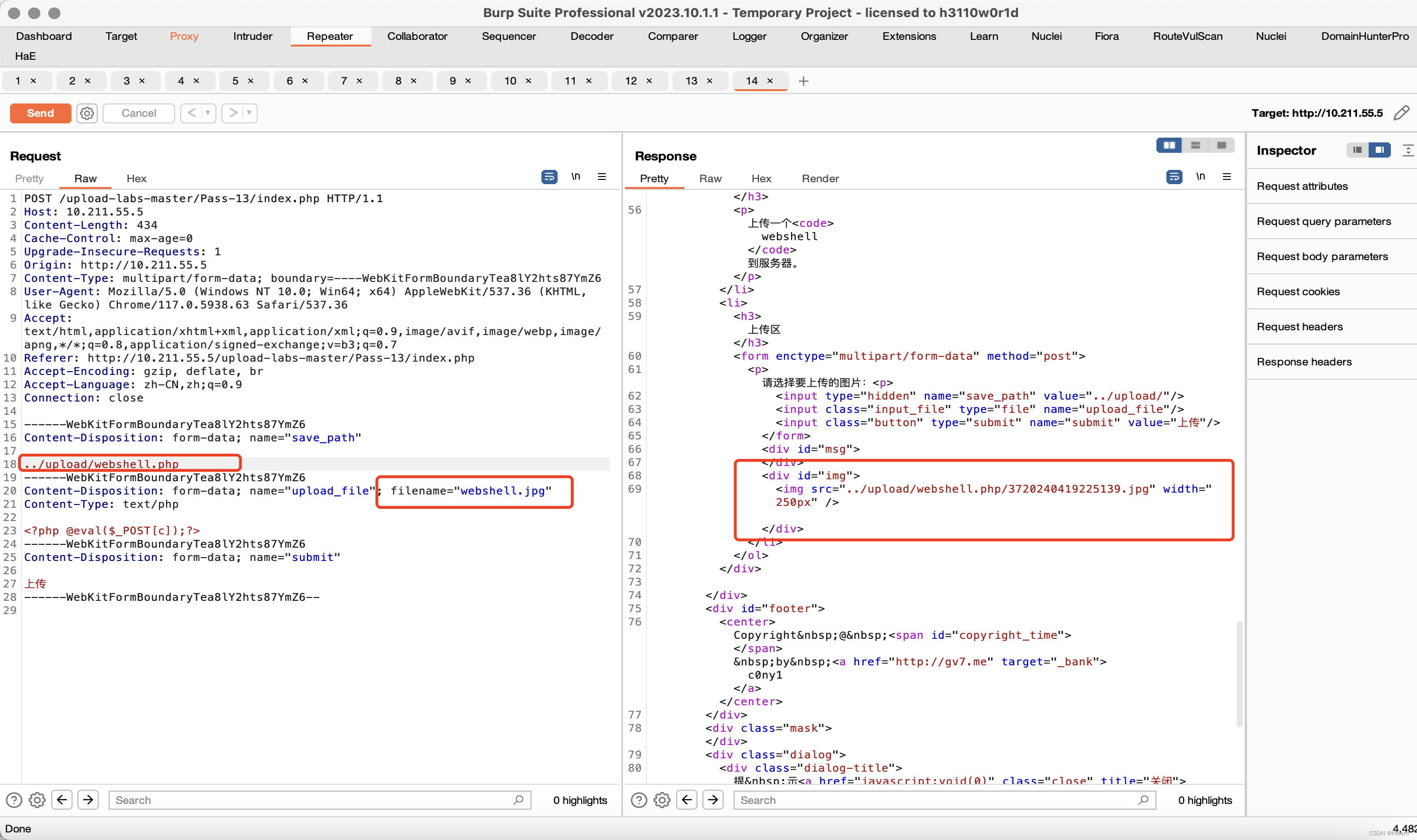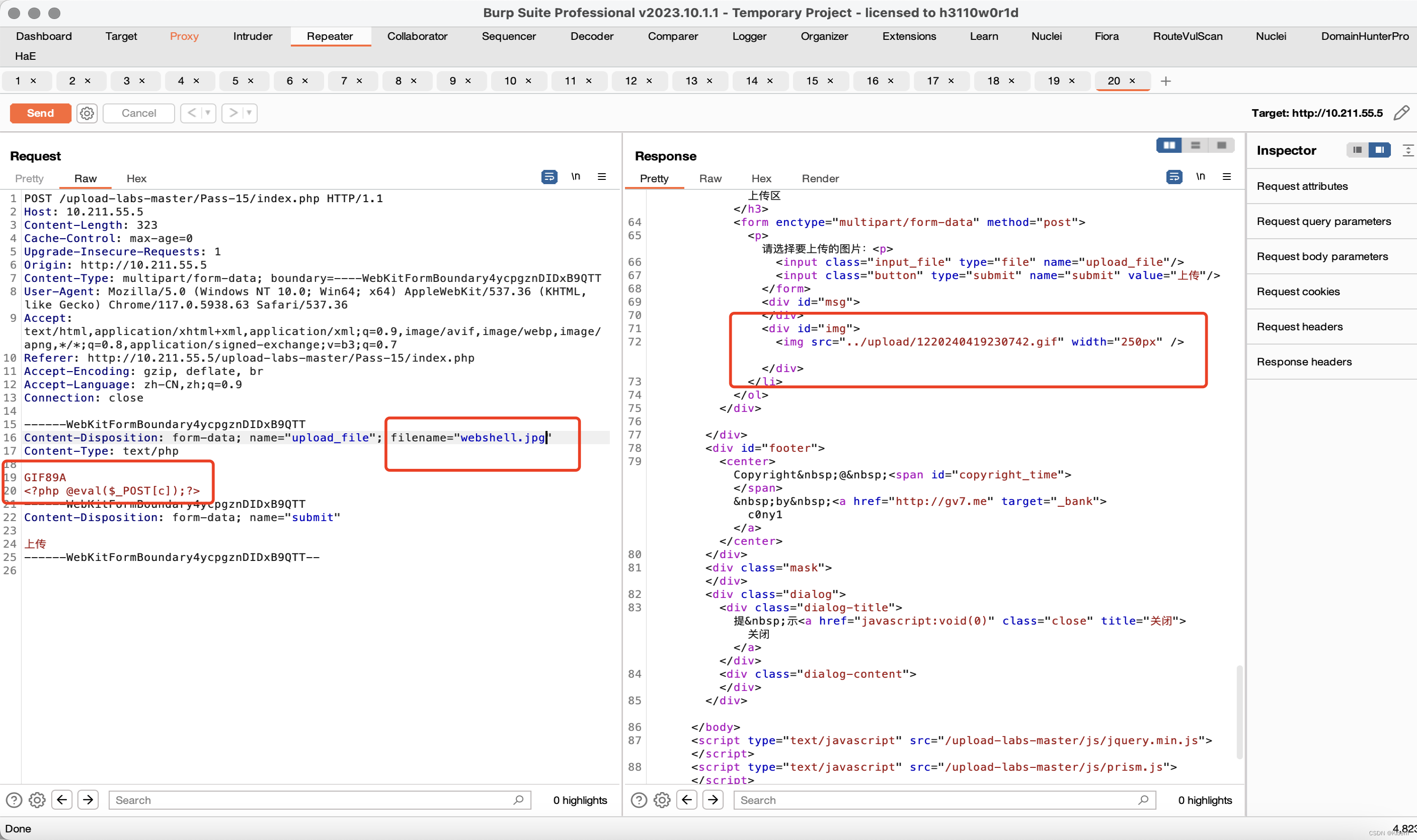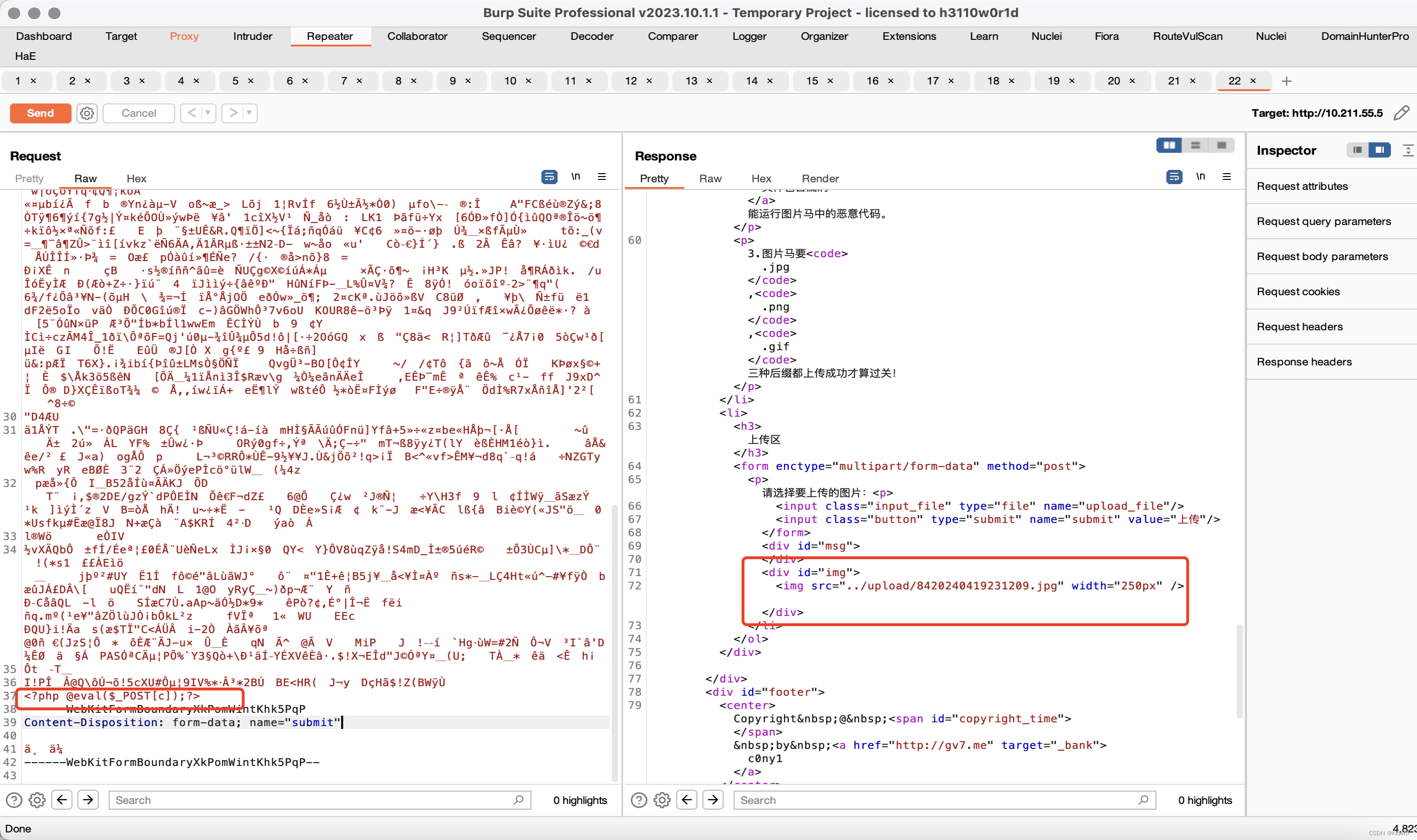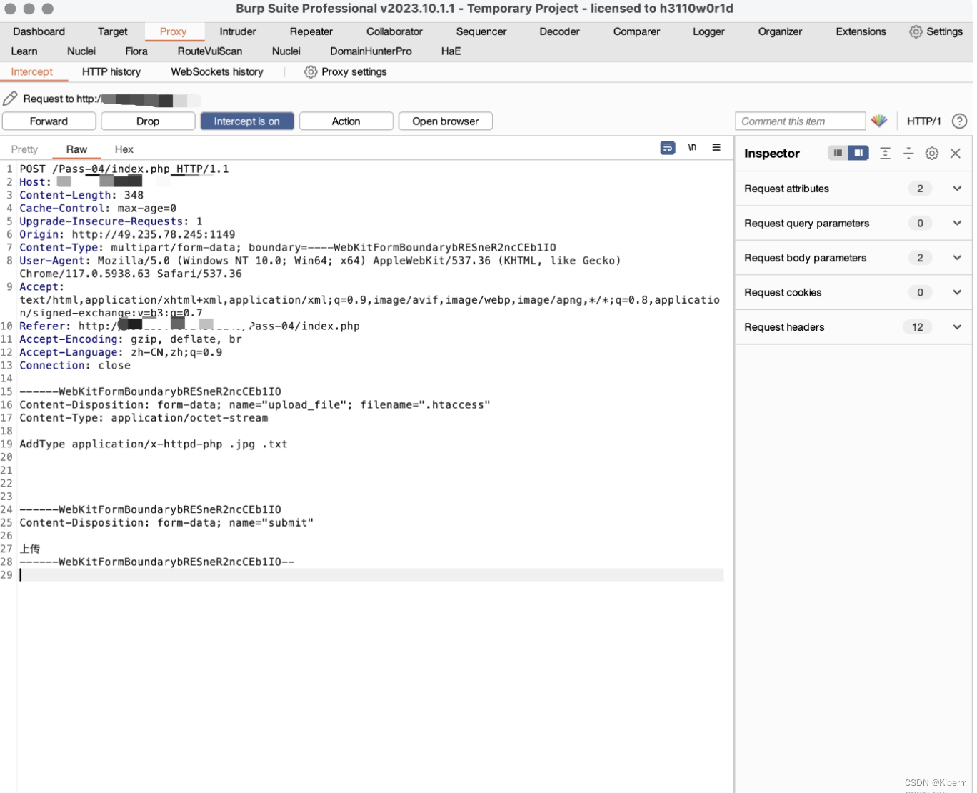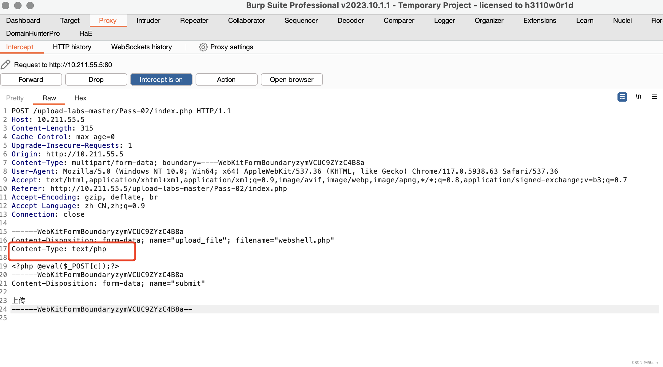 使用burpsuite抓取上传webshell.php的数据包, 将Content-Type字段的值修改成image/jpeg