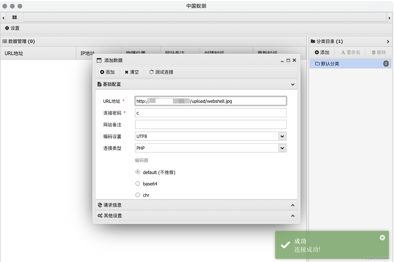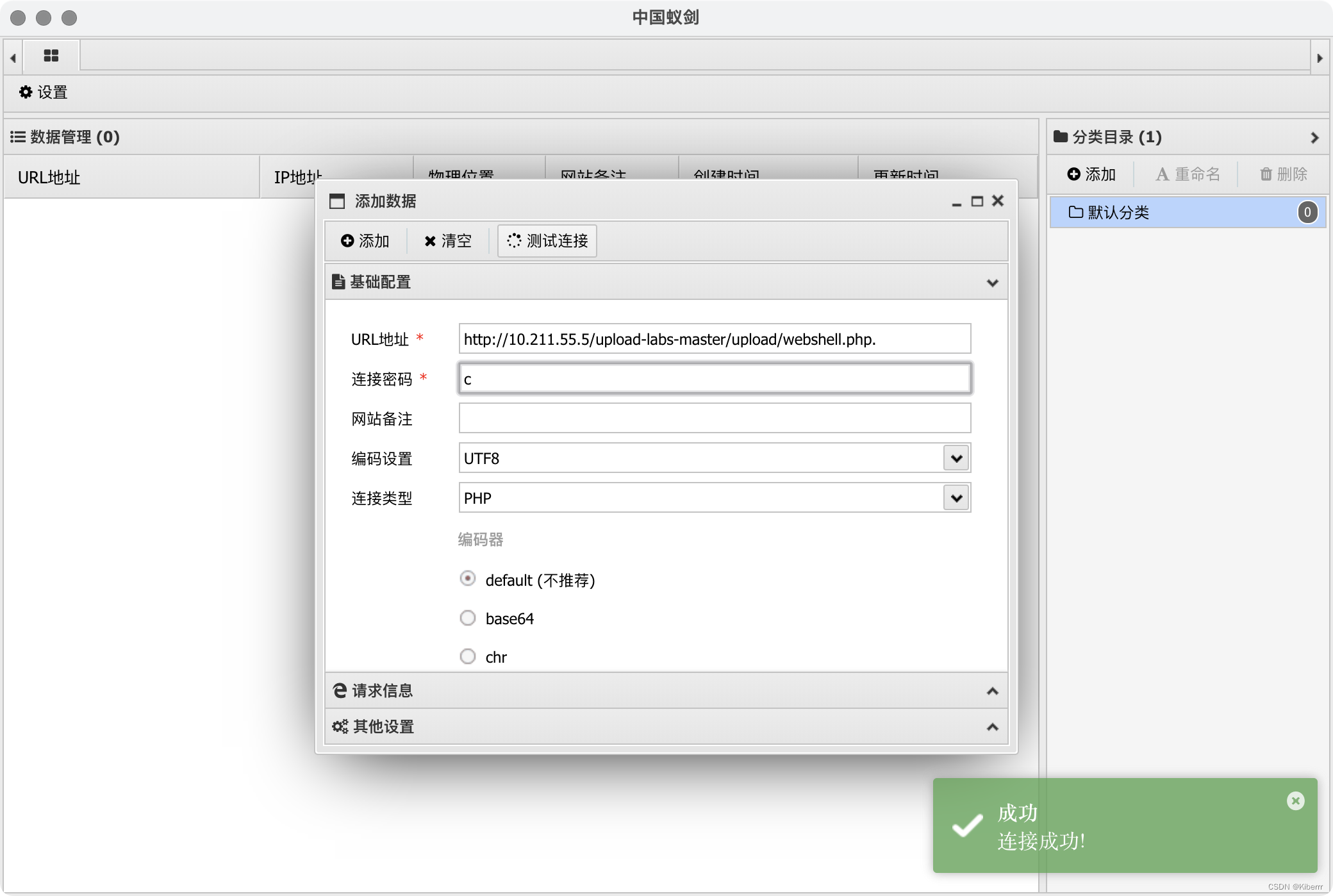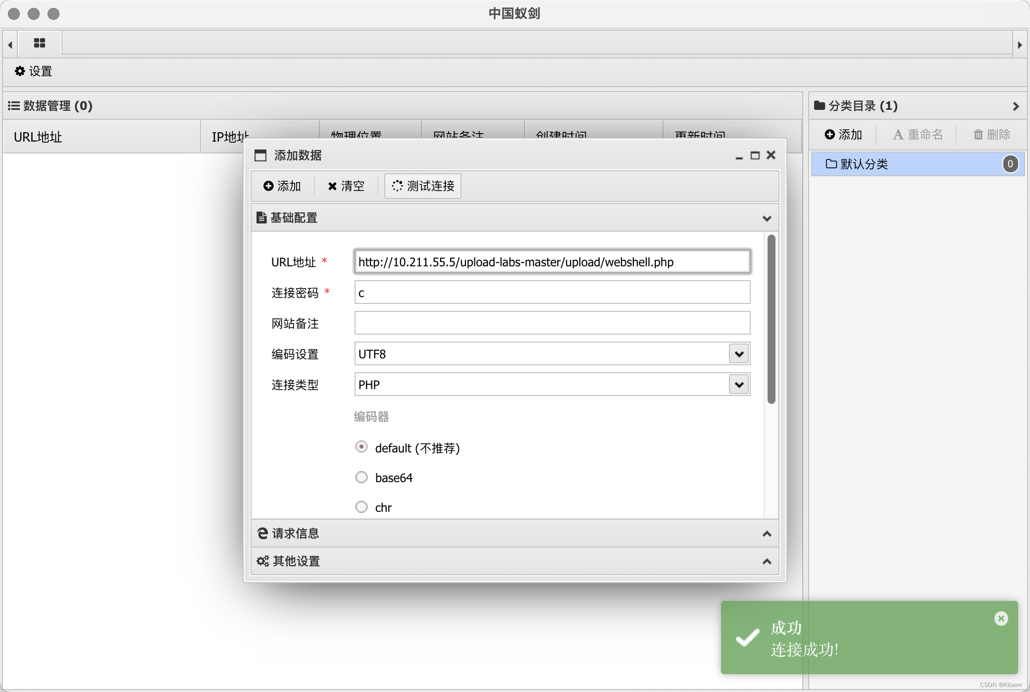 上传成功后访问脚本文件,打开蚁剑, 输入webshell的路径和密码, 然后点击测试连接, 显示连接成功。