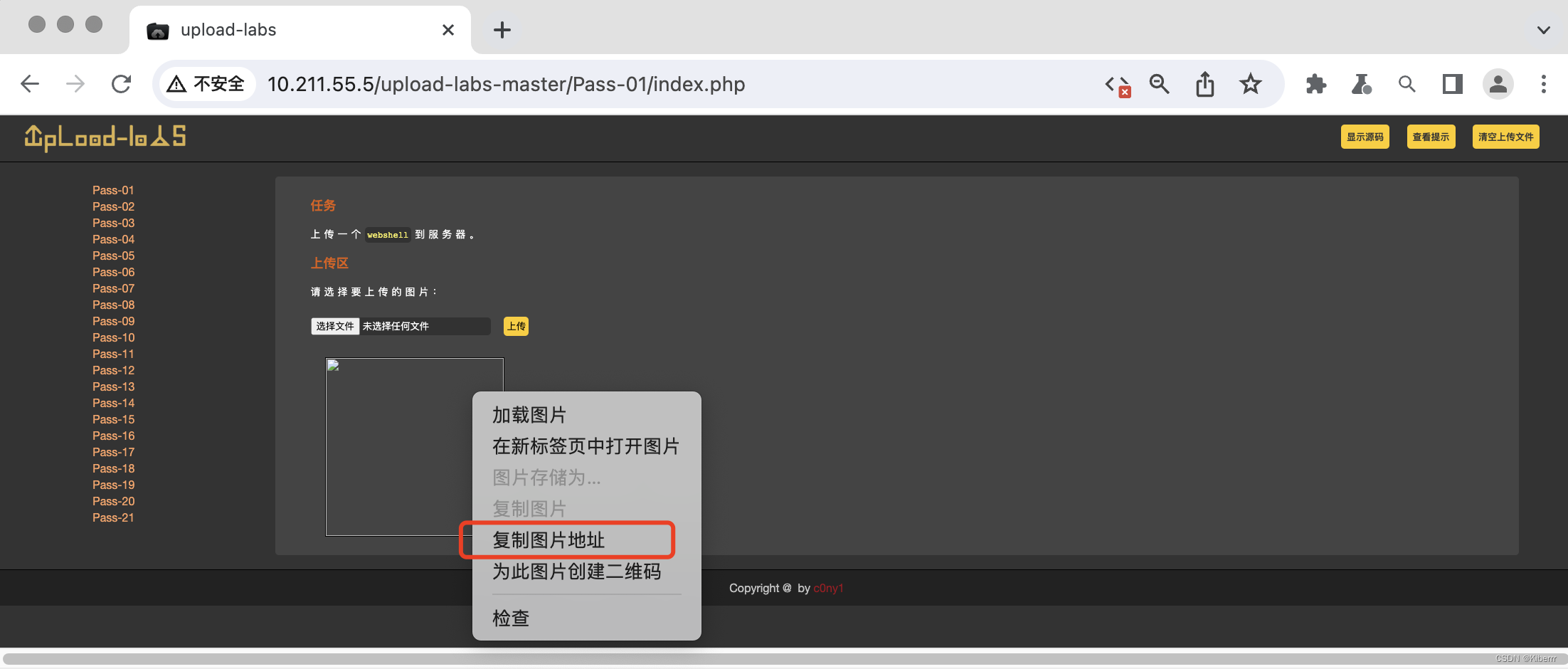 鼠标右键查看该图像的地址, 即为webshell的网页路径. 例如此处上传的webshell路径为http://10.211.55.5/upload-labs-master/upload/webshell.php