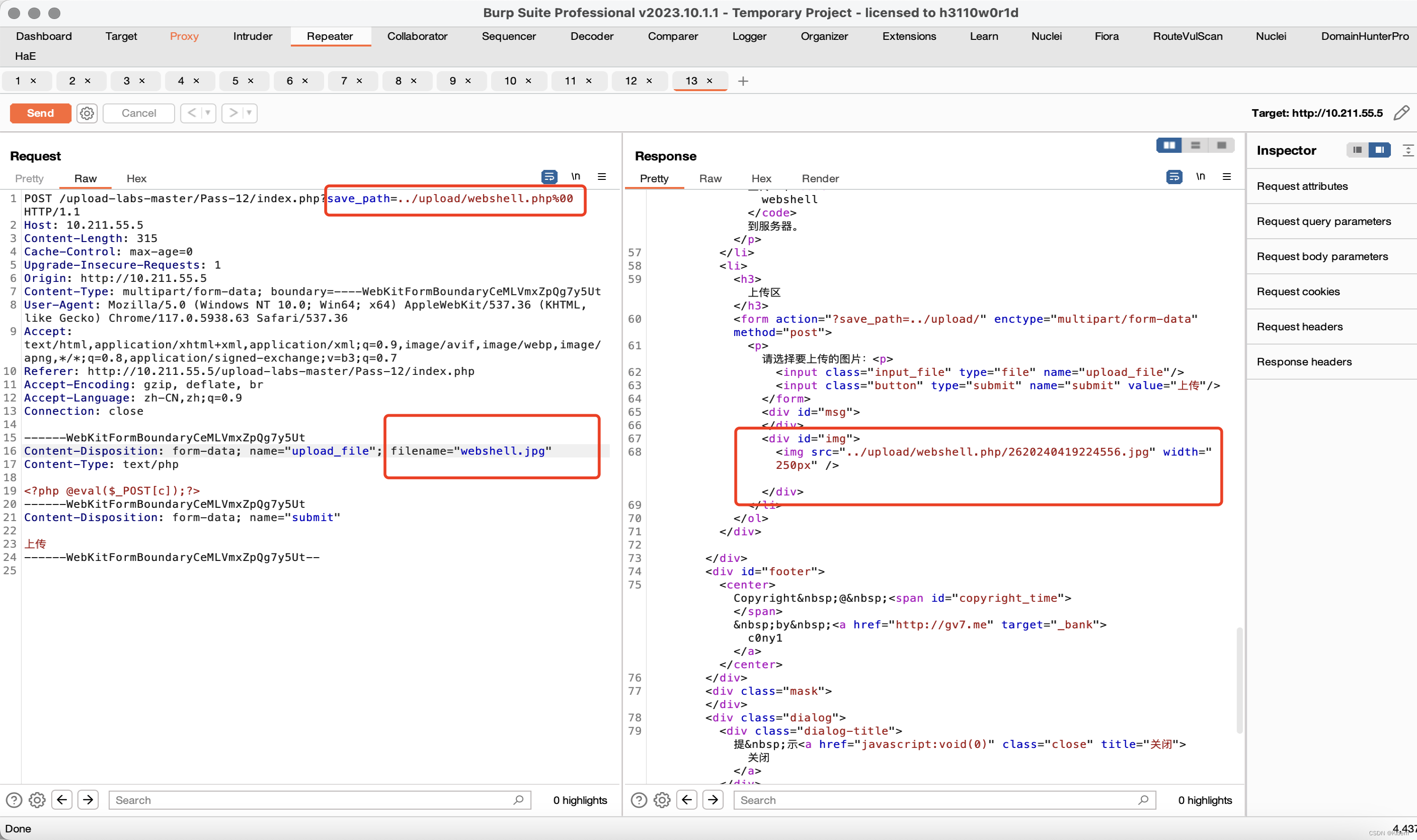 抓包修改post请求数据为../upload/webshell.php%00, 并对%00进行url解码