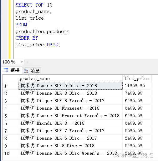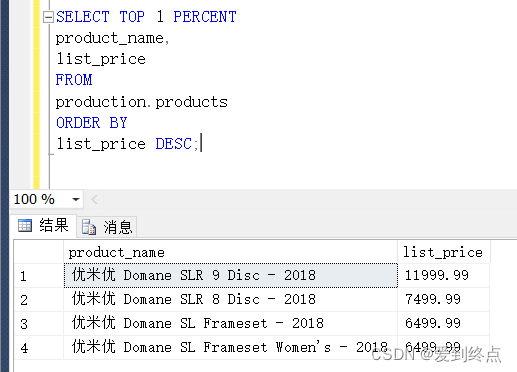 以下示例使用 PERCENT 指定结果集中返回的产品数。 production.products 表有 321 行,因此, 321的百分之一是分数值( 3.21 ),SQL Server将其进到下一个整数,在这种情况下是 4 行记录。