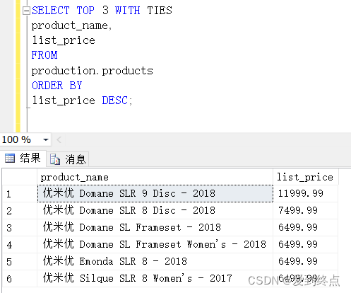 以下声明返回了最贵的前三个产品,与最后一行中的值匹配的行: