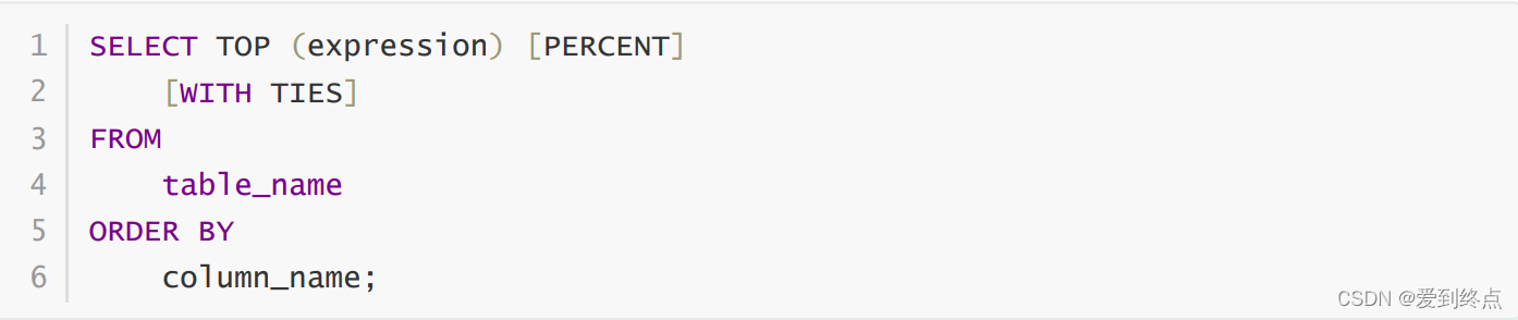 expression - TOP 关键字后面是一个表达式,它指定要返回的行数。 如果使用 PERCENT ,则将表达式计算为浮点值,否则将其转换为 BIGINT 值。