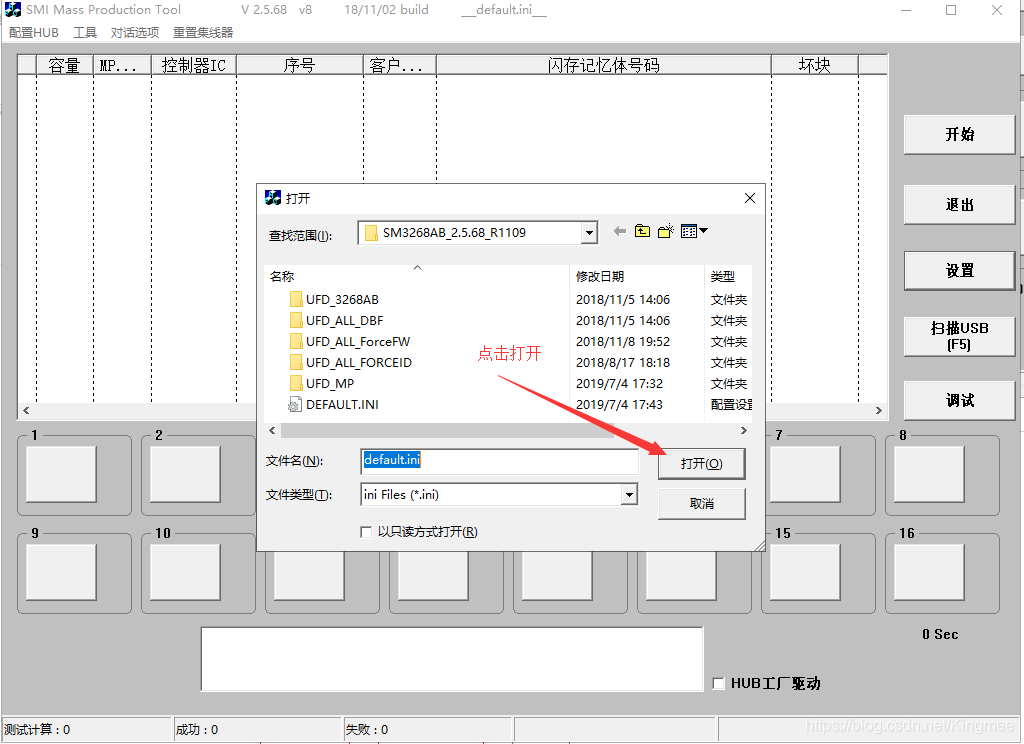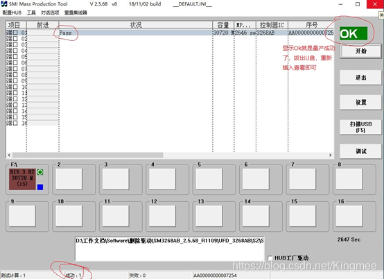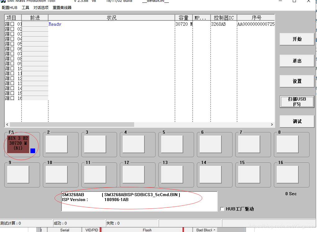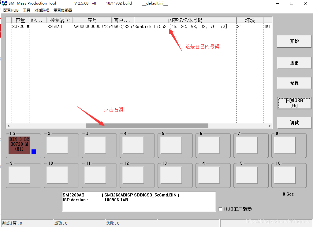 插入U盘,sm3268ab打开量产工具,然后点扫描就能识别你的U盘了,可以看到主控是SM3268ab的