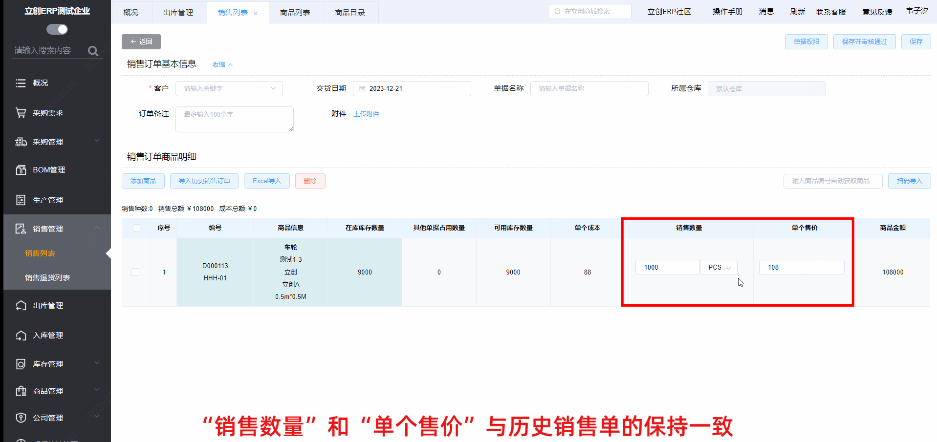 明细中商品的“销售数量”和“单个售价”与历史销售单的保持一致,但支持手动修改;最后点击【保存】将生成待审核的销售单;点击【保存并审核通过】将生成生效的销售单。
