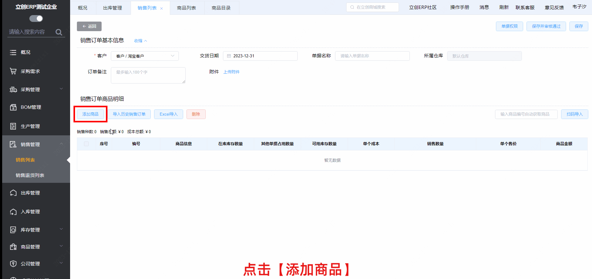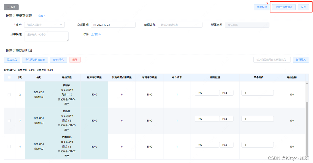最后,可点击【保存】将生成待审核的销售单;点击【保存并审核通过】将生成生效的销售单。
