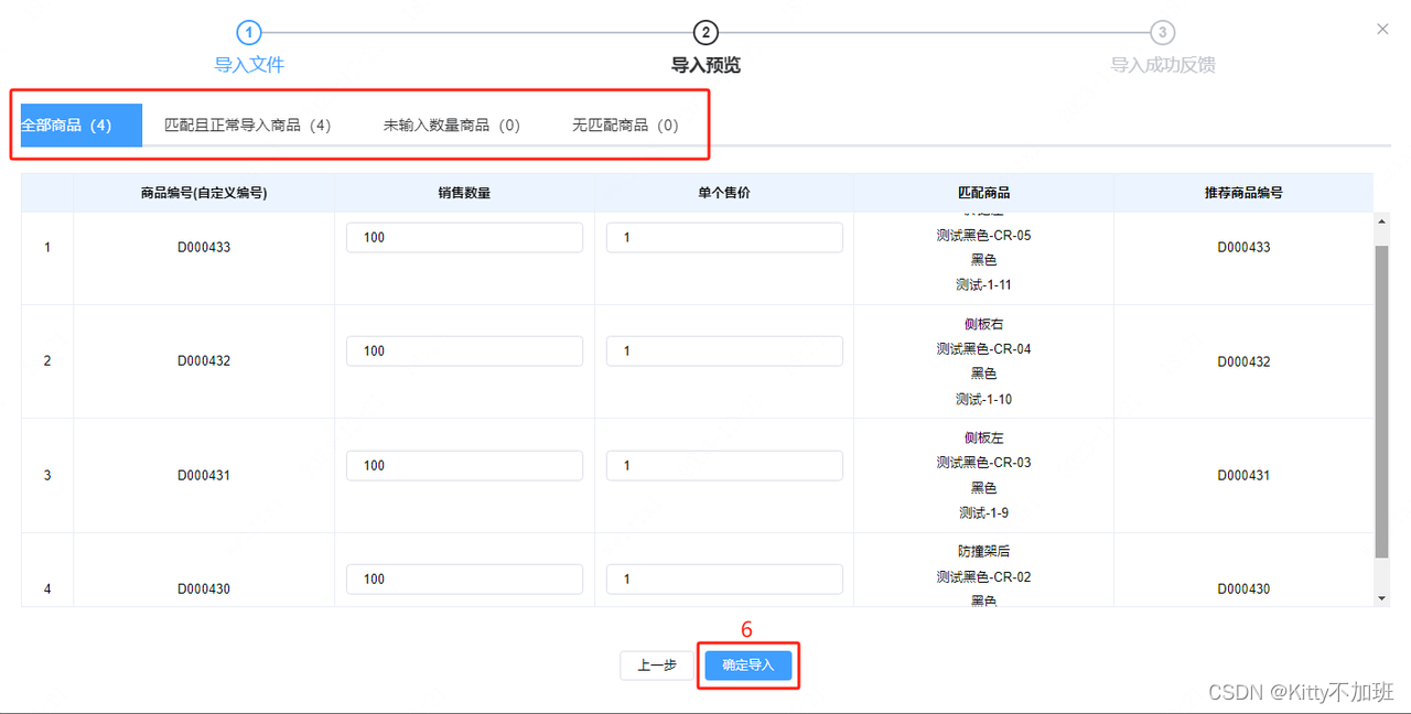 这一步可以比对一下“匹配且正常导入商品”的数量是否与表格填写的商品数量一致,如“未输入数量商品”、“无匹配商品”有数量提示,可放弃当前操作,重新检查导入的表格是否按照要求填写正确;