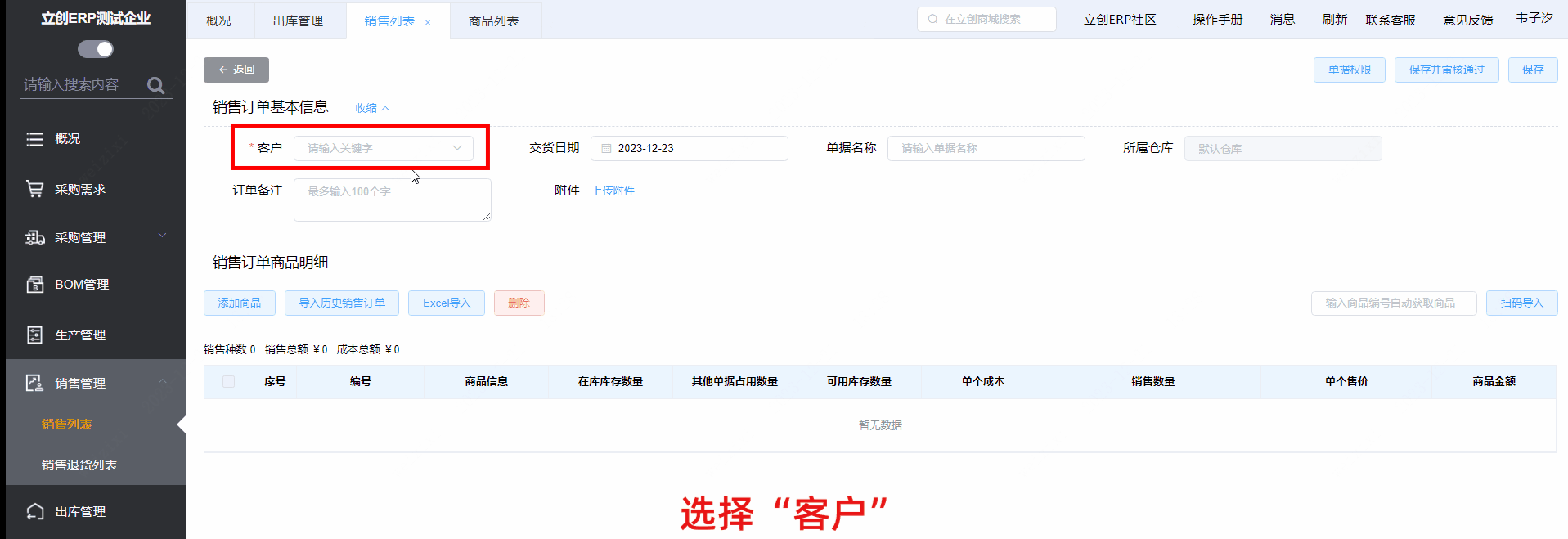 选择“客户”;选择“交货日期”,交货日期默认代入当天日期,支持手动更换当天后任意日期;“单据名称”、“订单备注”为选填项,可按需填写。
