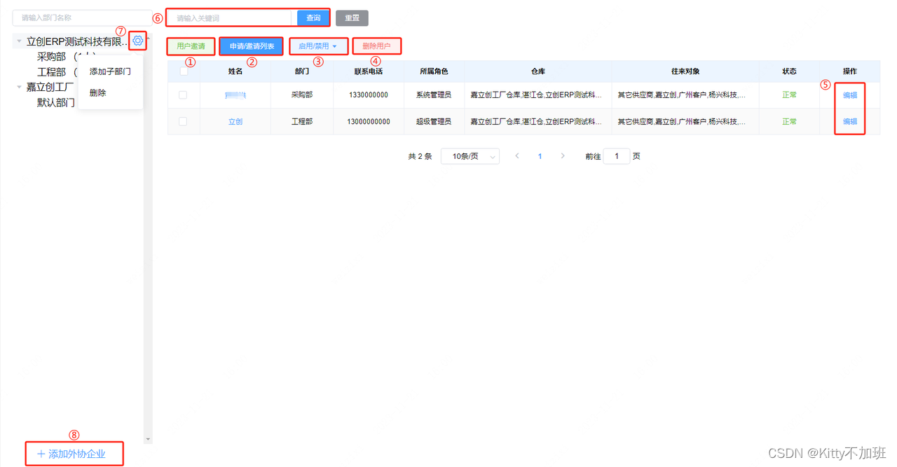 ⑤【编辑】可设置/变更对应人员在企业内的姓名、联系电话、所在部门、所属角色、仓库以及往来对象。