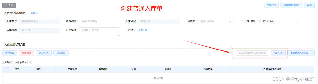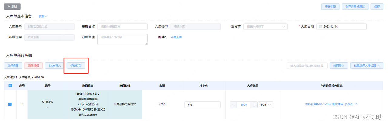 在商品进行入库时,入库单创建页面有【标签打印】的按钮