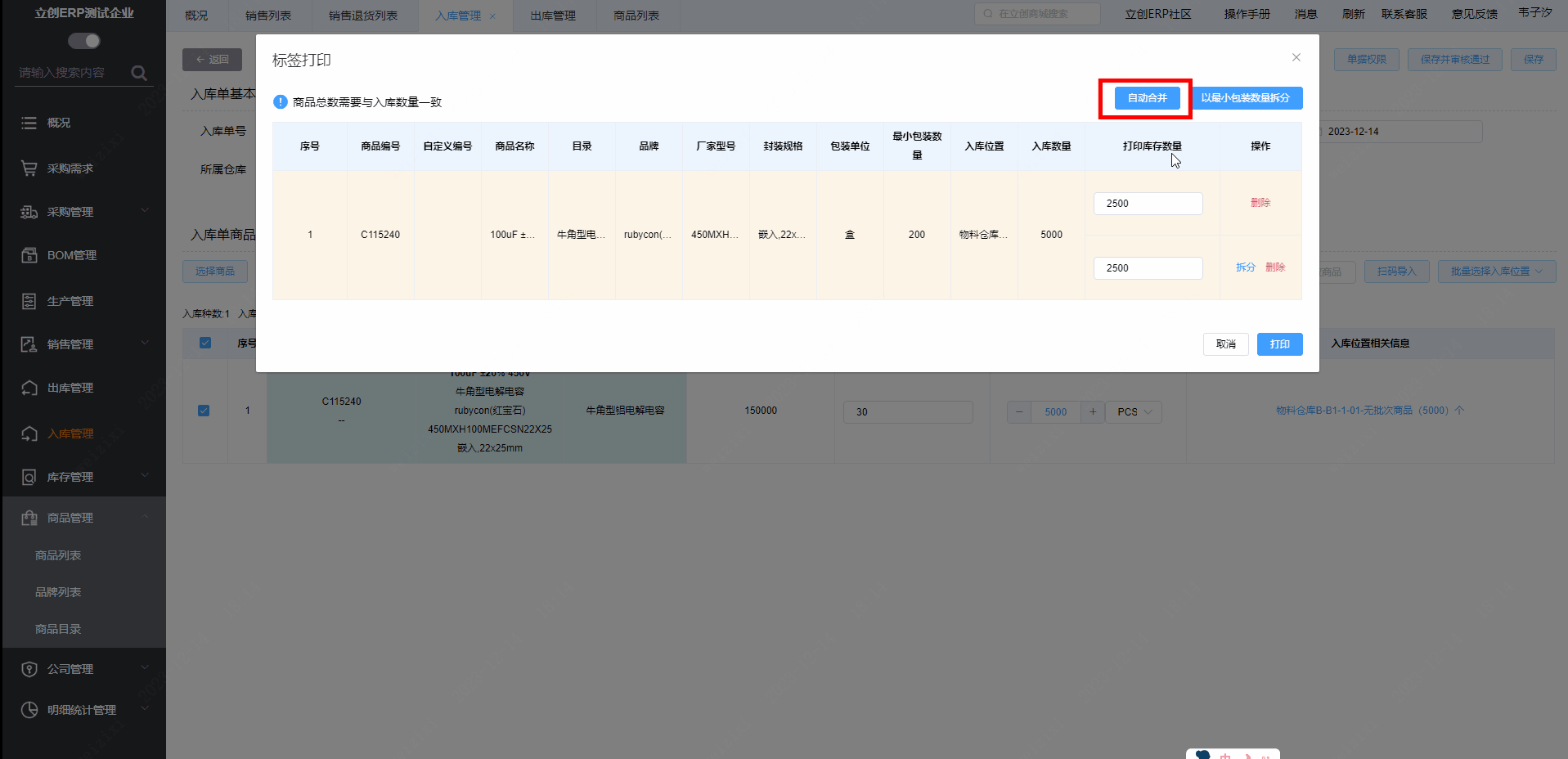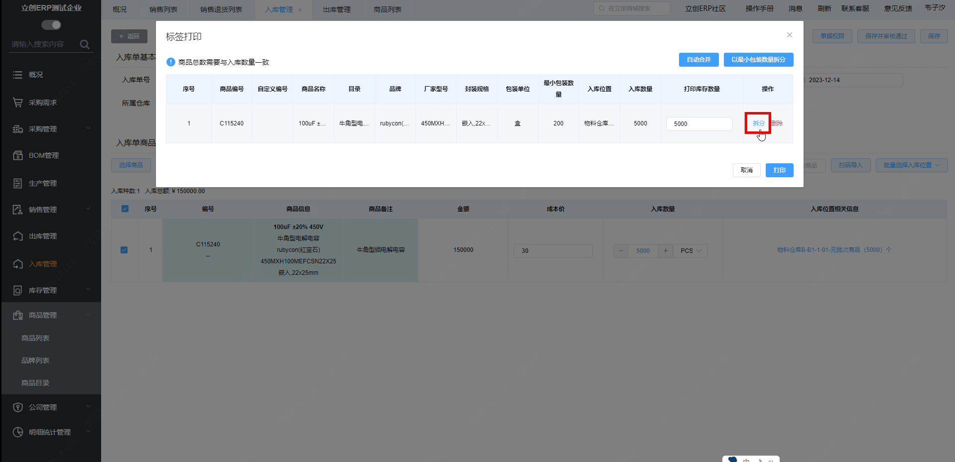 点击【拆分】可以自定义打印标签的数量。比如说本次商品入库5000个,只需要打印两张标签的话,可以点击【拆分】,“打印库存数量”可以各输入2500进行打印,最终将打印出2张初始库存为2500的标签。