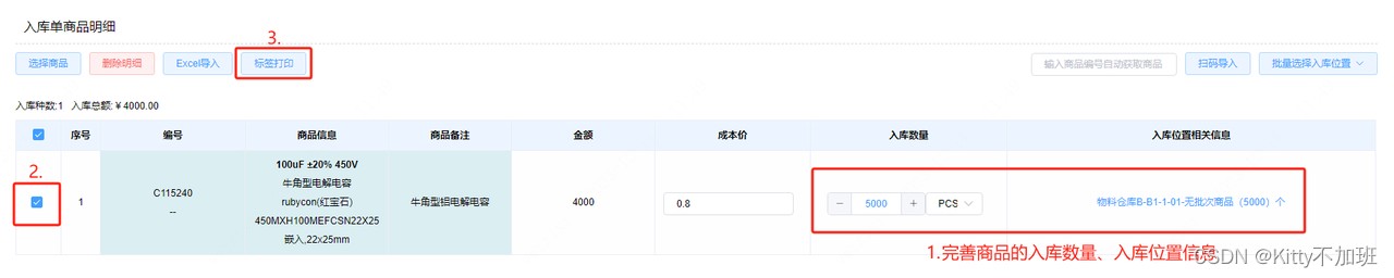 将入库商品添加到入库商品明细列表,填写入库数量、选择入库位置之后,将商品选中,点击【标签打印】