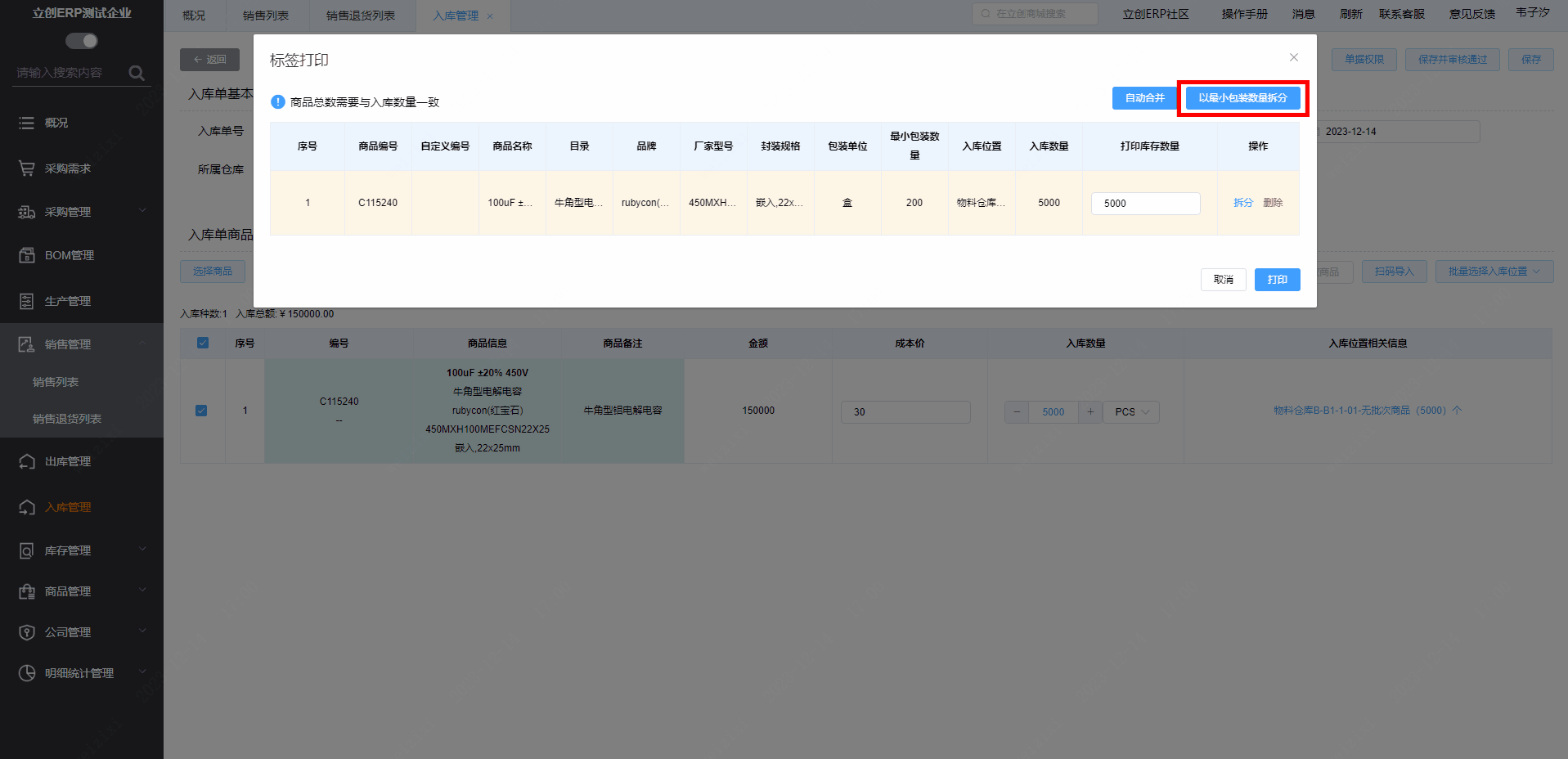 在标签打印页面中,点击【以最小包装数量拆分】,将以入库数量/最小包装数量得出的值打印标签。