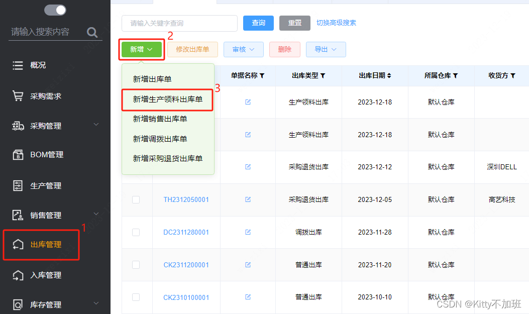 点击【出库管理】→【新增】→【新增生产领料出库单】