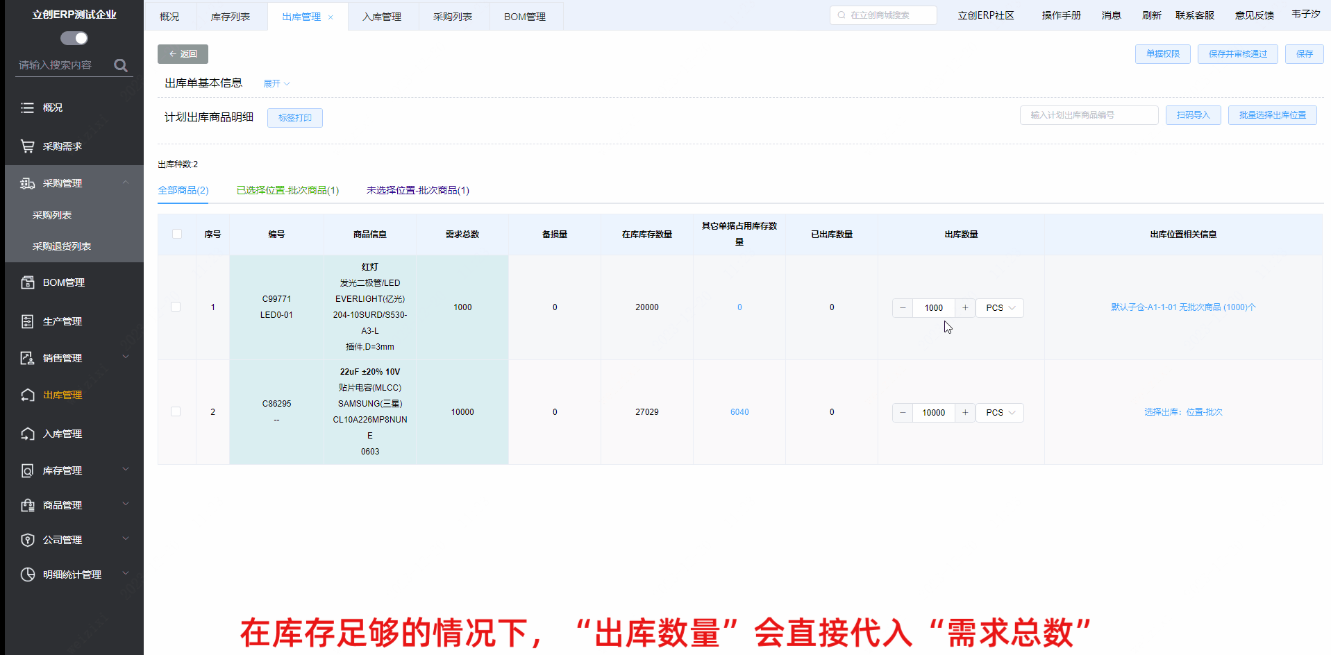 在库存足够的情况下,“出库数量”将直接代入“需求总数”,但支持手动修改;然后选择商品的出库位置