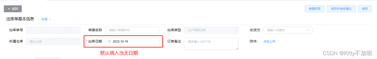 “出库日期”默认填入当天日期,但支持手动更换当天后的任意日期;其他信息项为选填项。