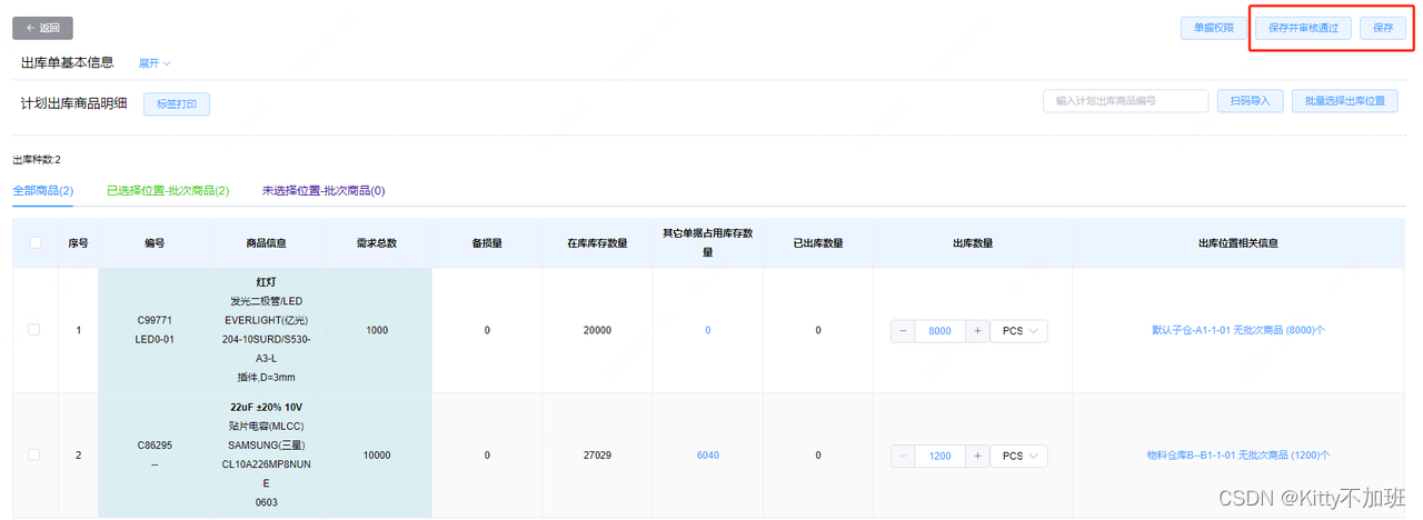 出库位置选择好了之后,点击【保存】,将生成待审核的出库单(可以继续修改、删除);点击【保存并审核通过】将生成生效的出库单(不可再修改、删除)。