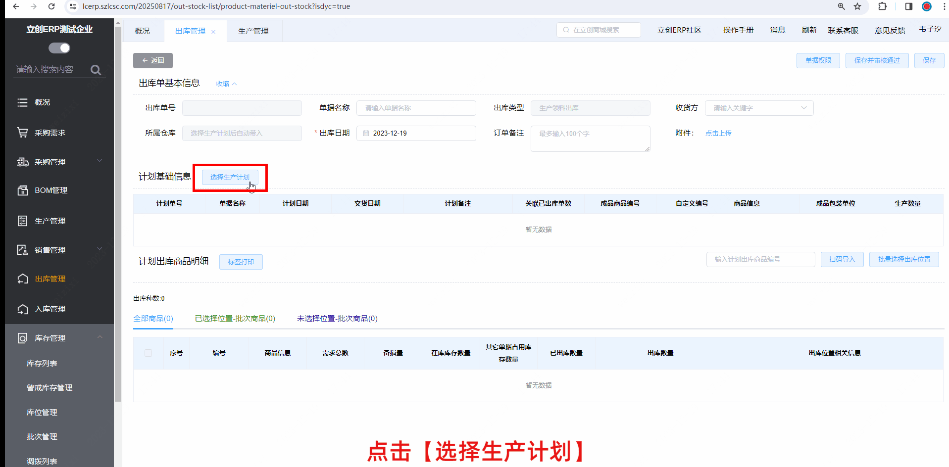 点击【选择生产计划】,选中需要领料的生产计划,点击【确定】,将生产计划的用料明细导入到出库商品明细列表中。