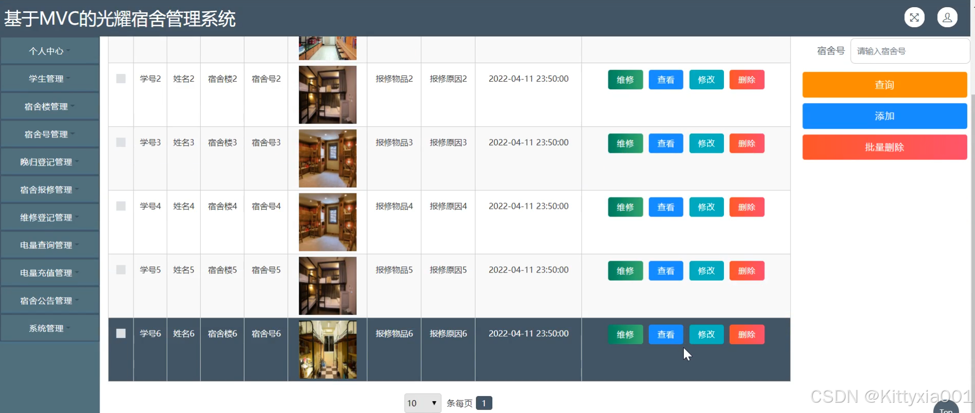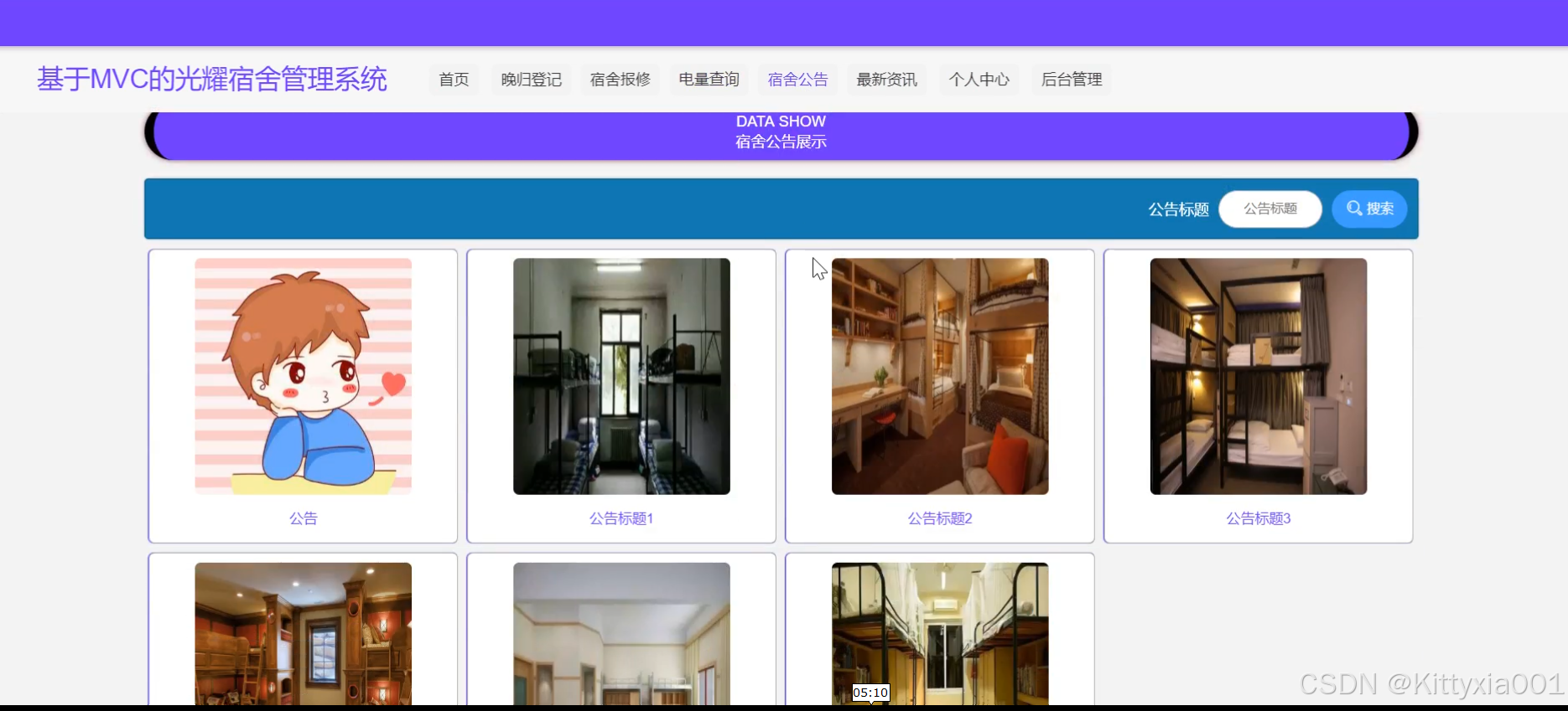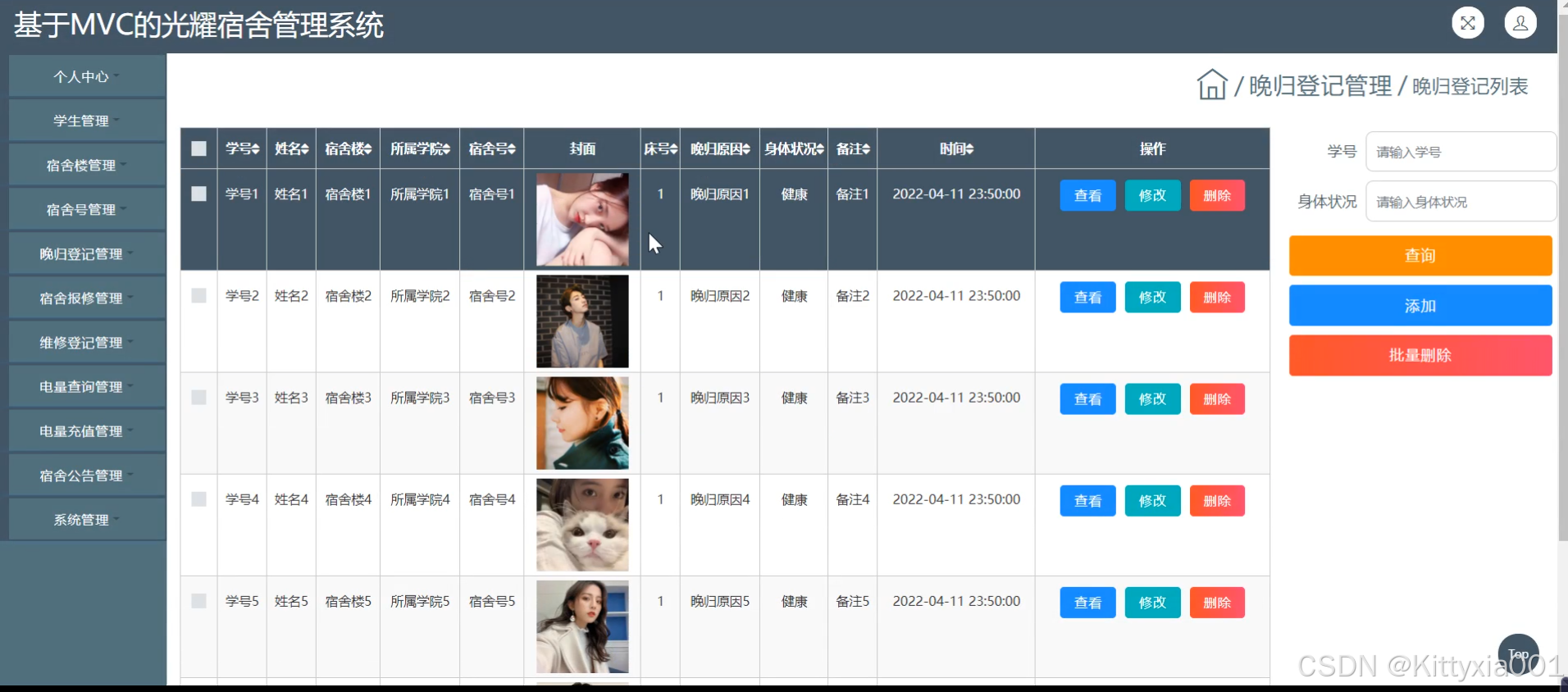 系统功能:学生,宿舍楼,晚归登记,宿舍报修,维修登记,电量查询,电量充值,宿舍公告,宿舍号